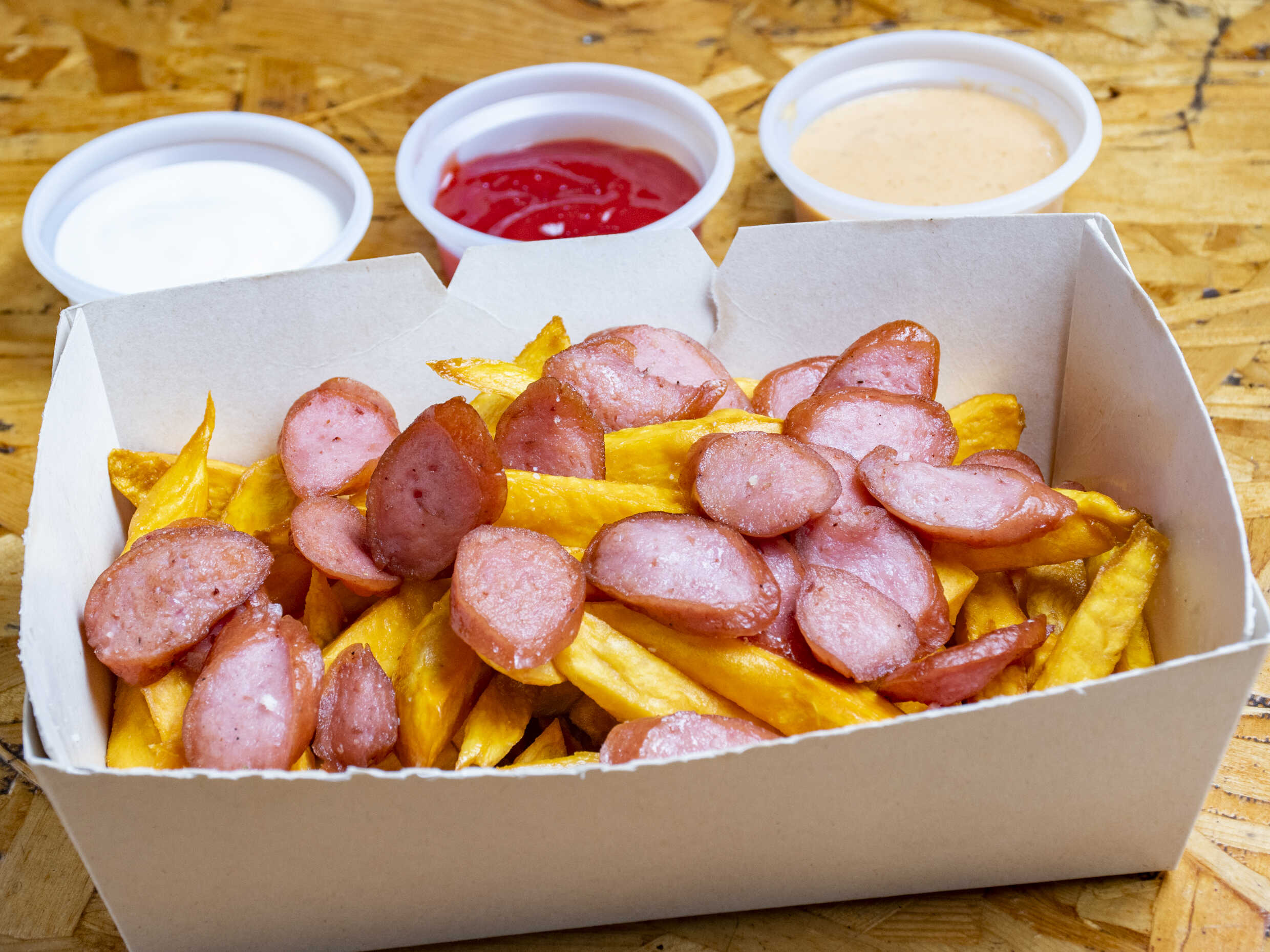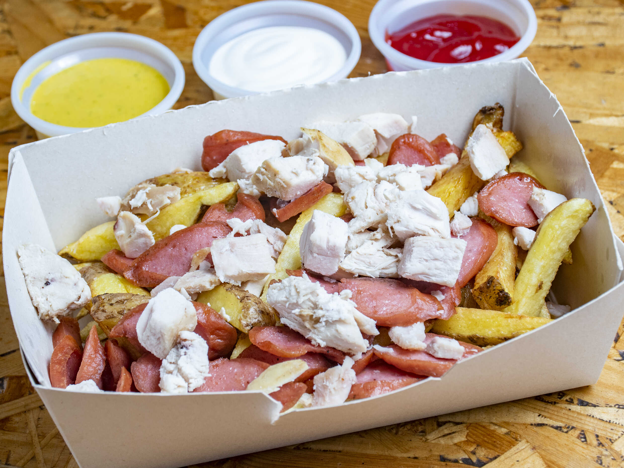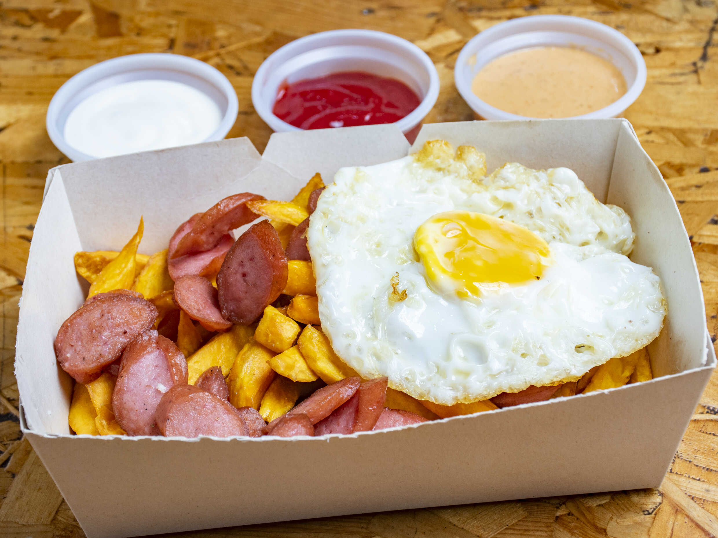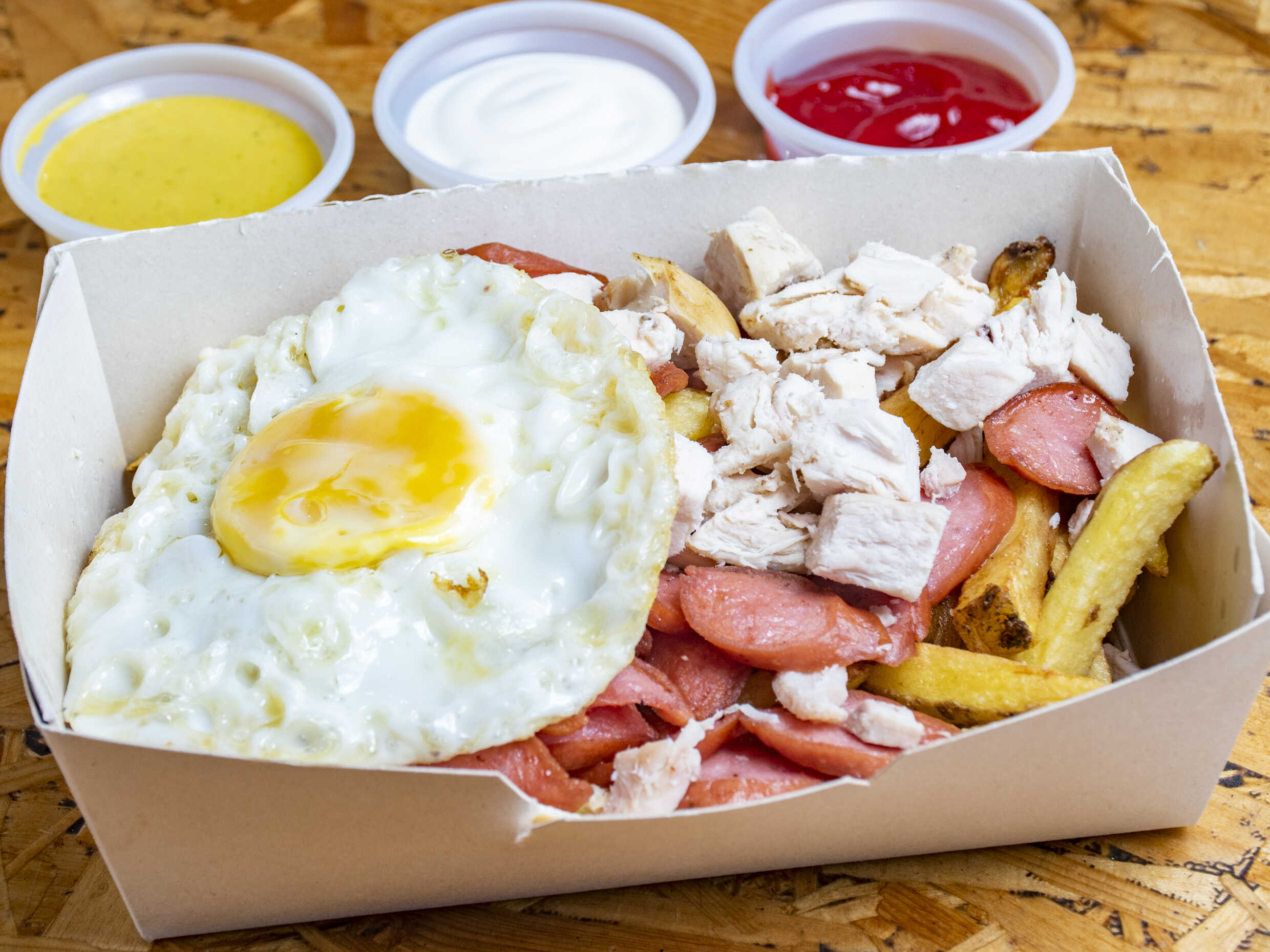 Frankfurter en slides, pollo a la brasa deshilachado, papa amarilla frita y un huevo frito. Inclye 3 salsas a tu elección.