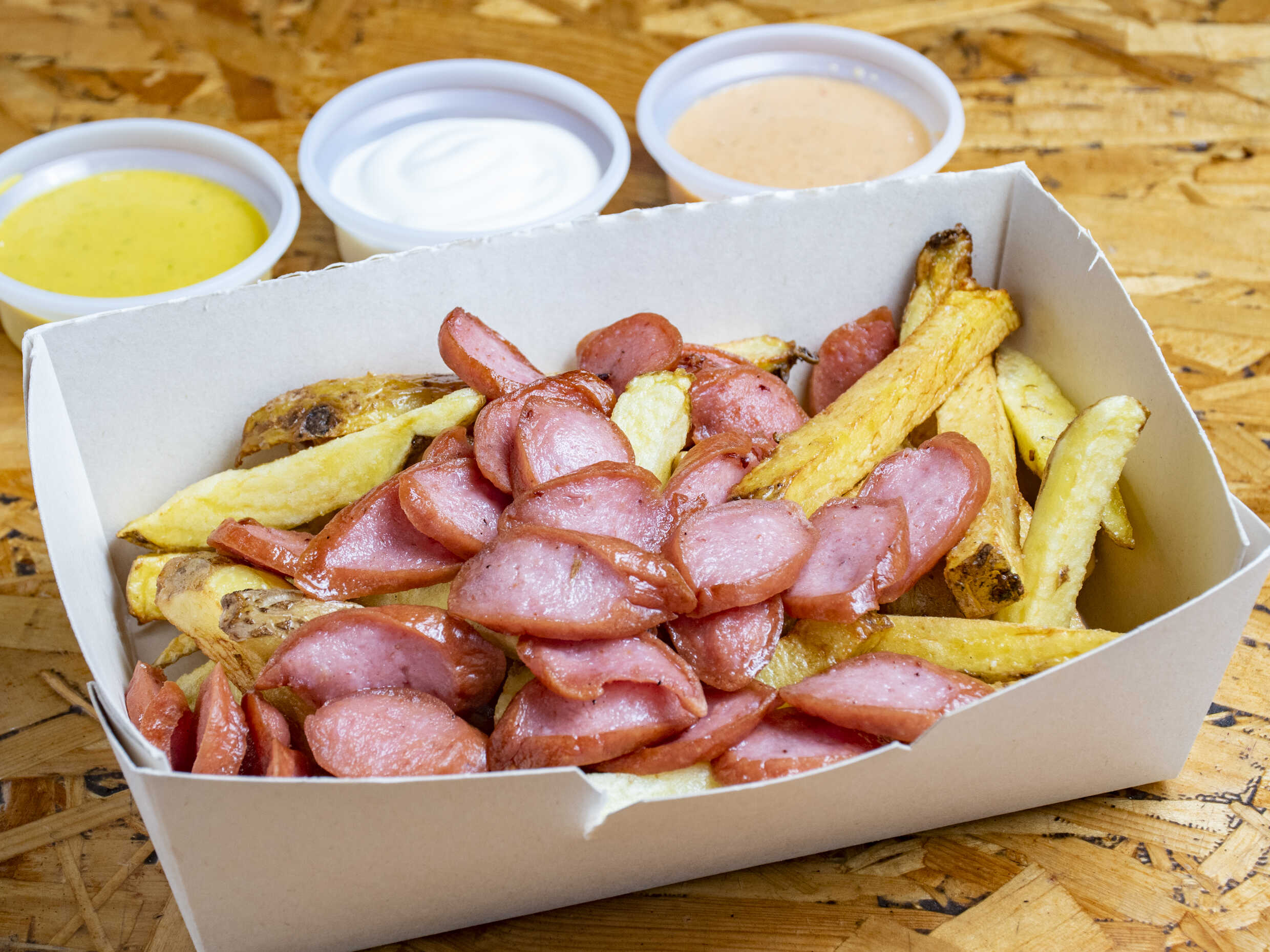 Frankfurter en slides acompañado con bastones de papa amarilla frita. Incluye 3 salsas a escoger