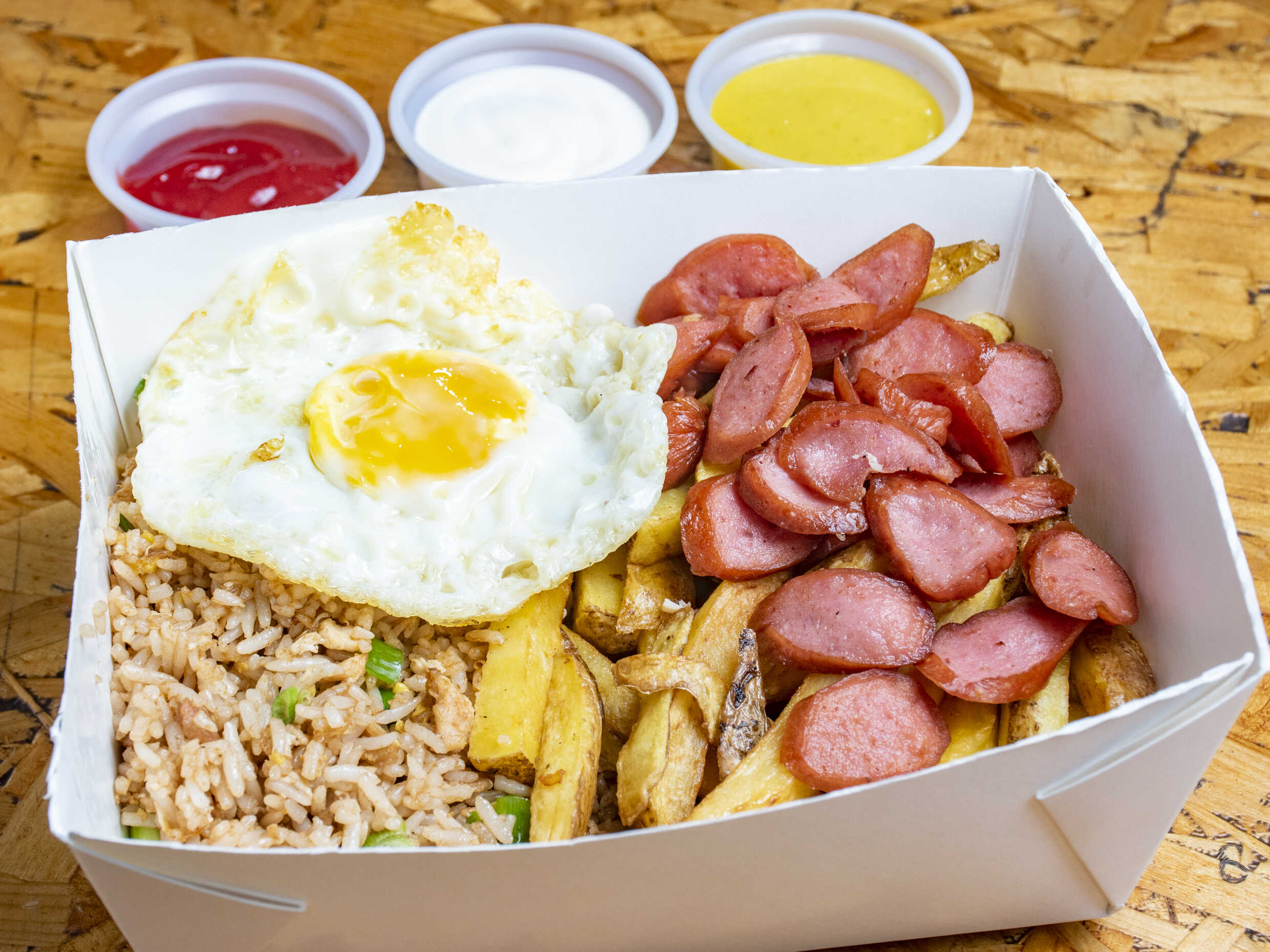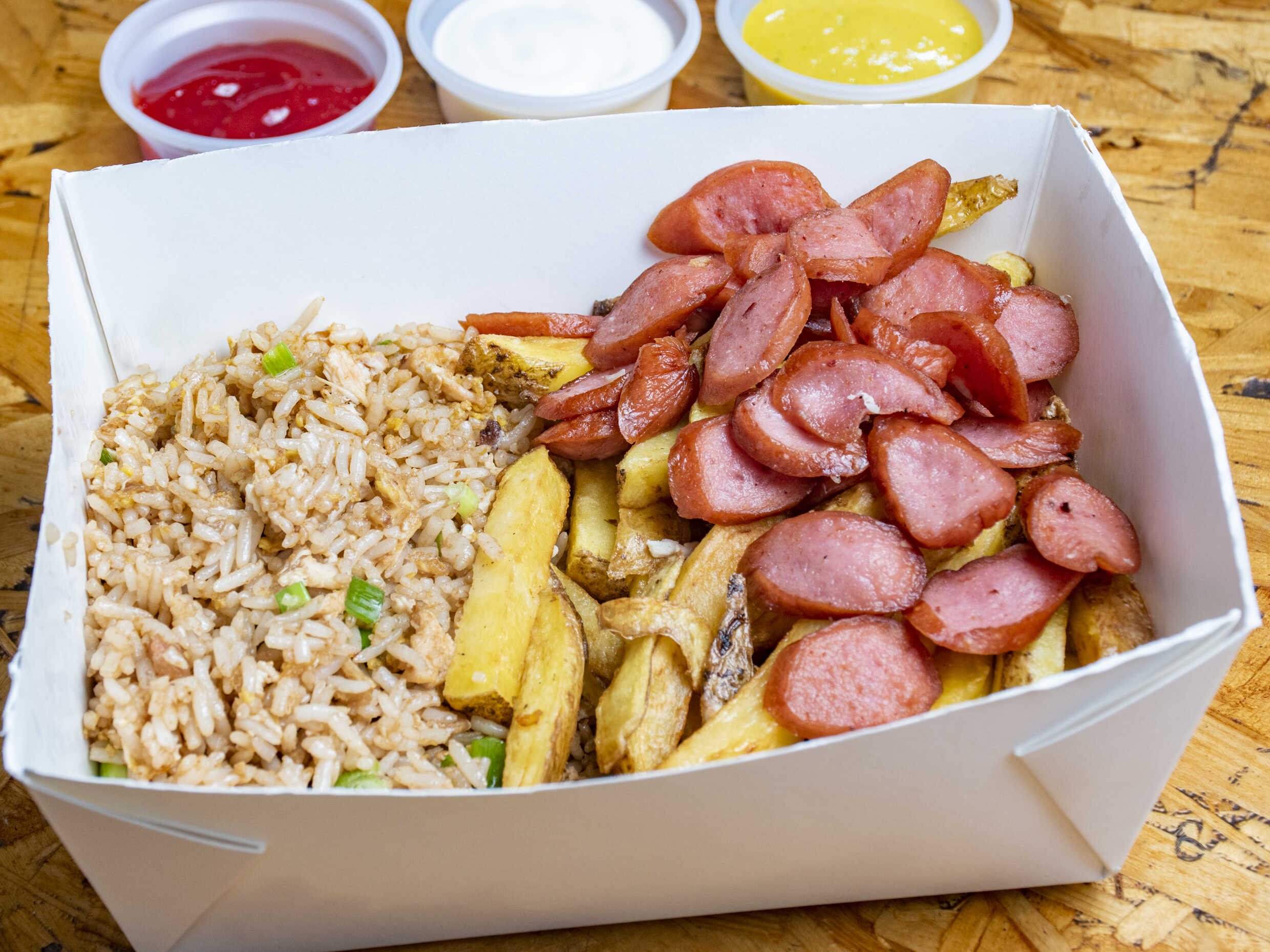 Frankfurter en slides, arroz chaufa, papa amarilla frita y huevo frito. Inclye 3 salsas a tu elección.