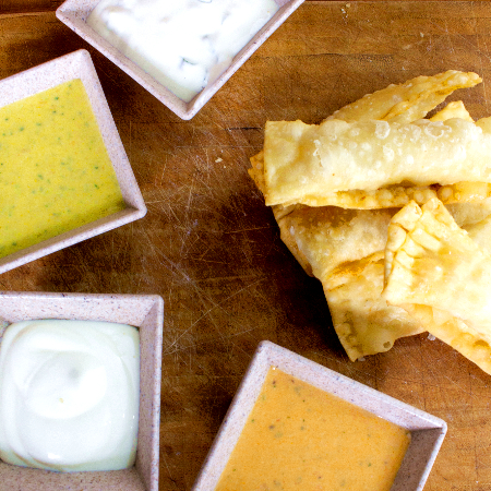 6 tequeños rellenos con pollo a la brasa. Incluye 3 salsas a tu elección.