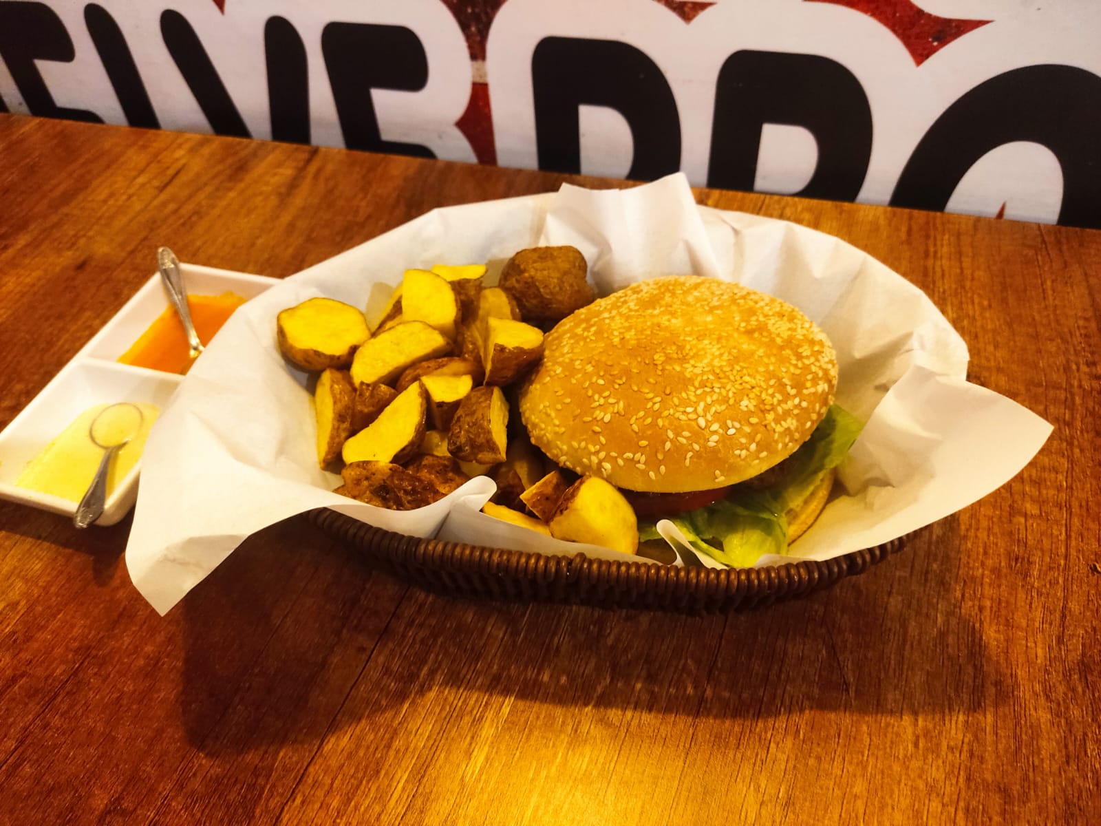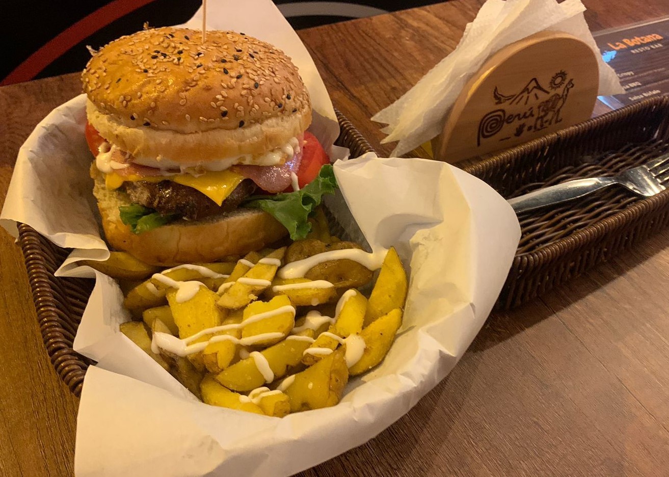 Pan brioche, 120 gramos de carne, queso, jamón, huevo más papas nativas con gaseosa.