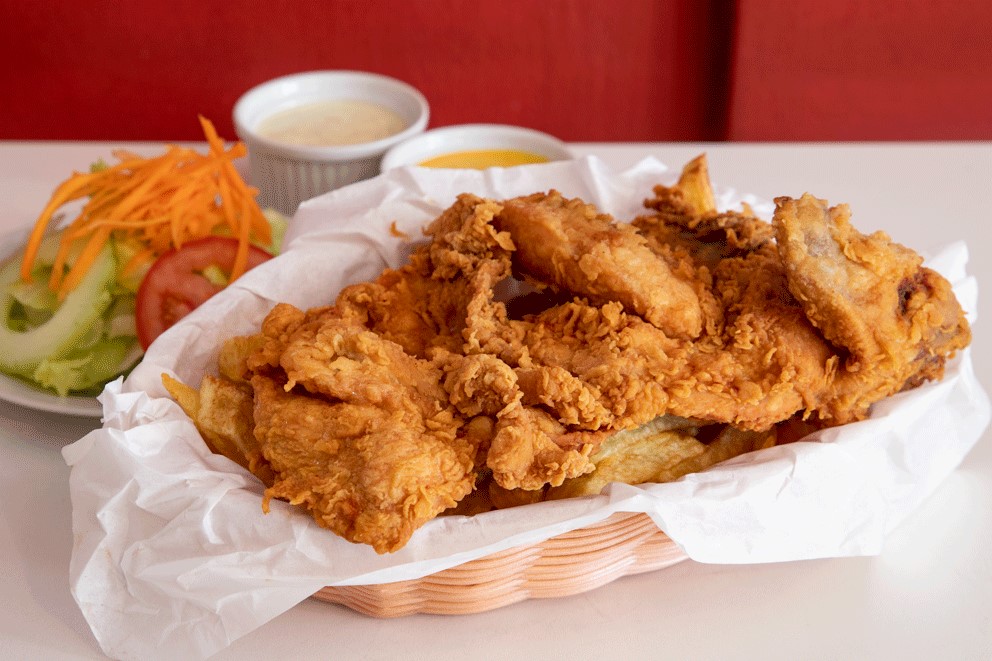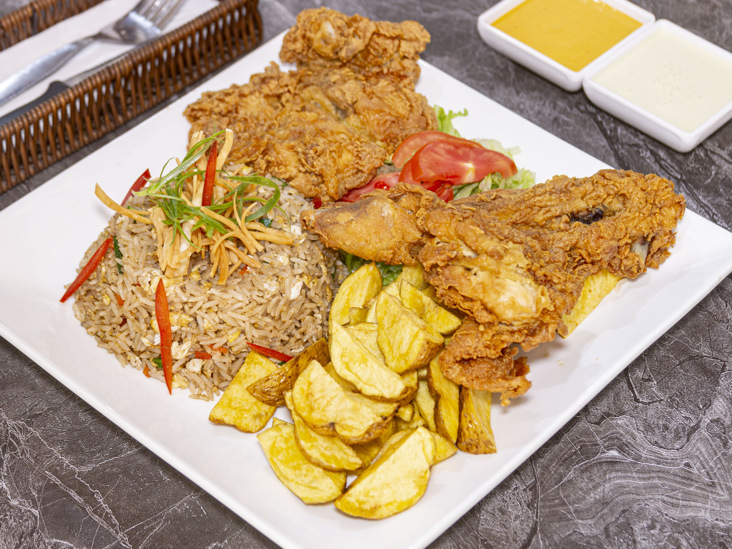 Pecho broaster, papas nativas, ensalada y gaseosa.