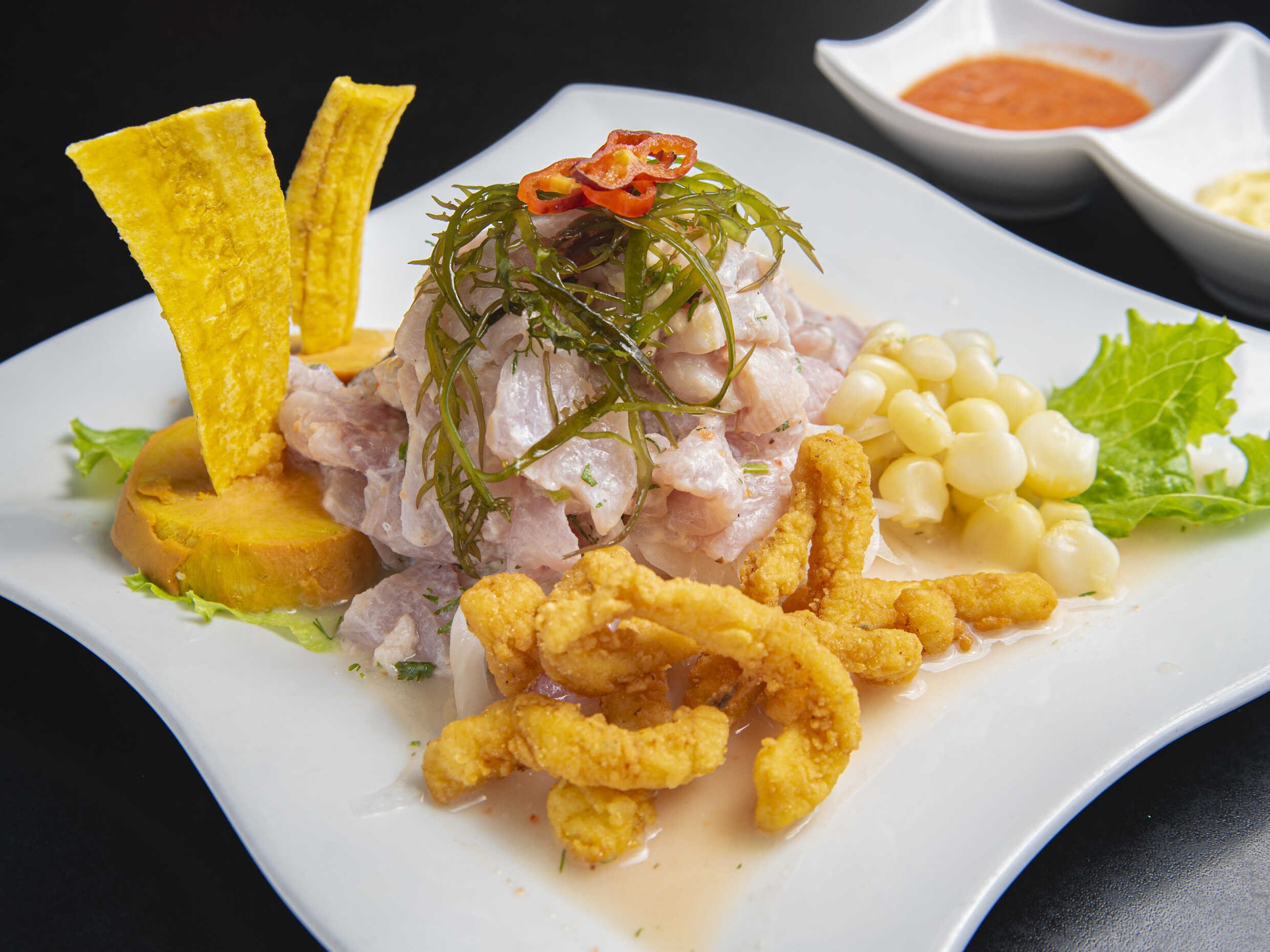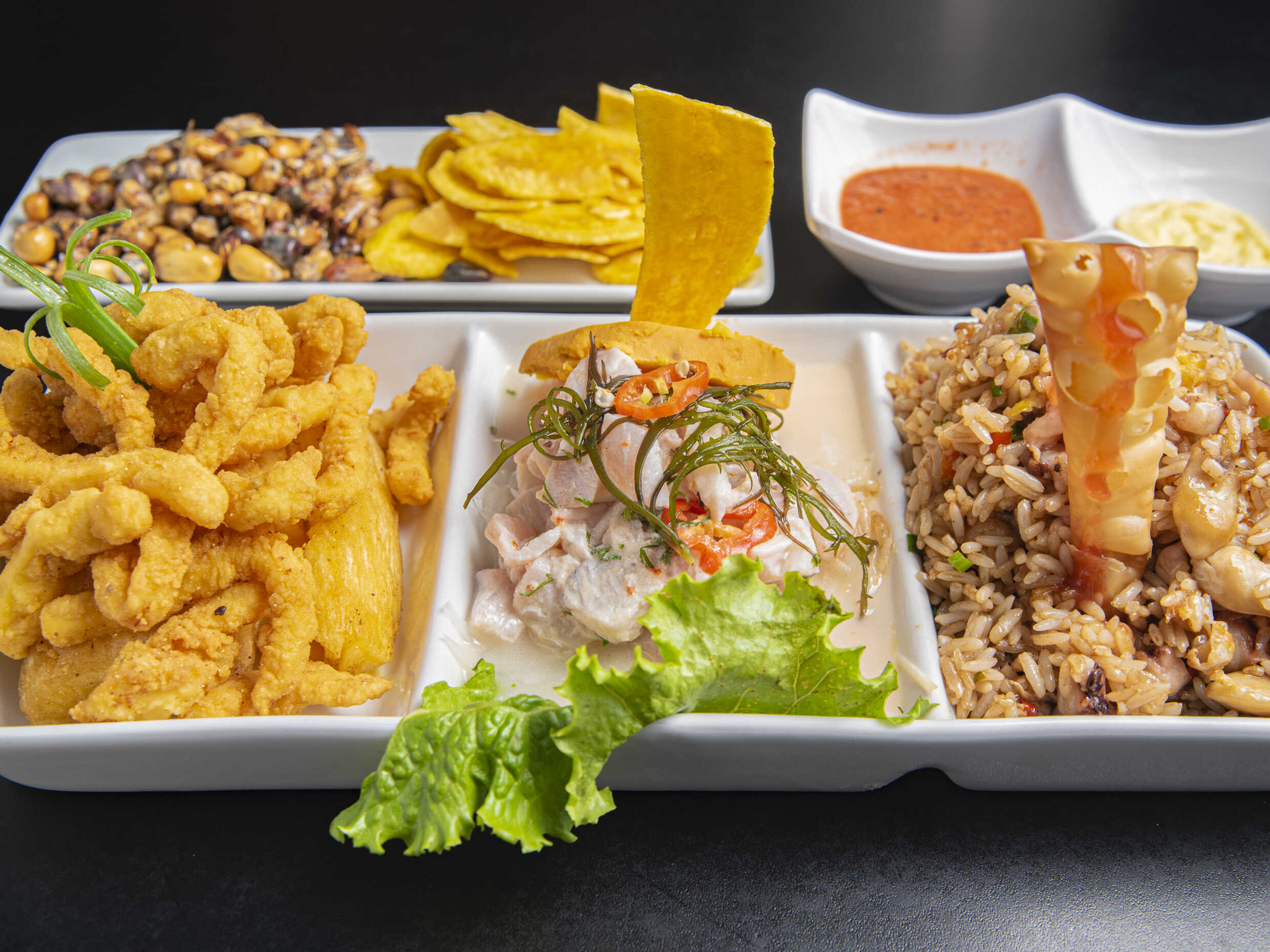Ceviche, Chicharrón de Pota y Chaufa de Mariscos