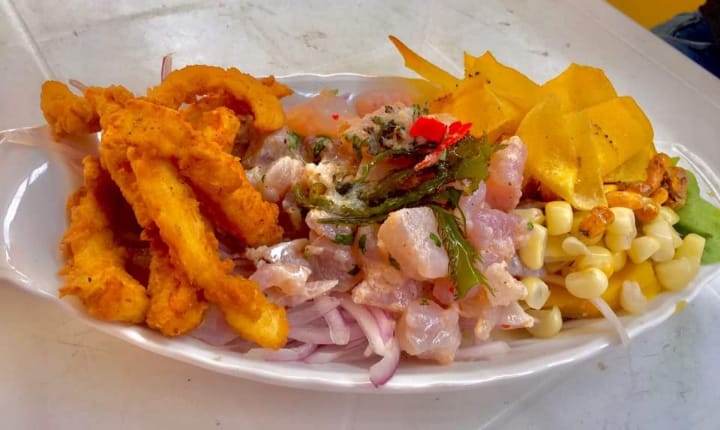 Ceviche, Chicharrón de Pota y Arroz con Mariscos