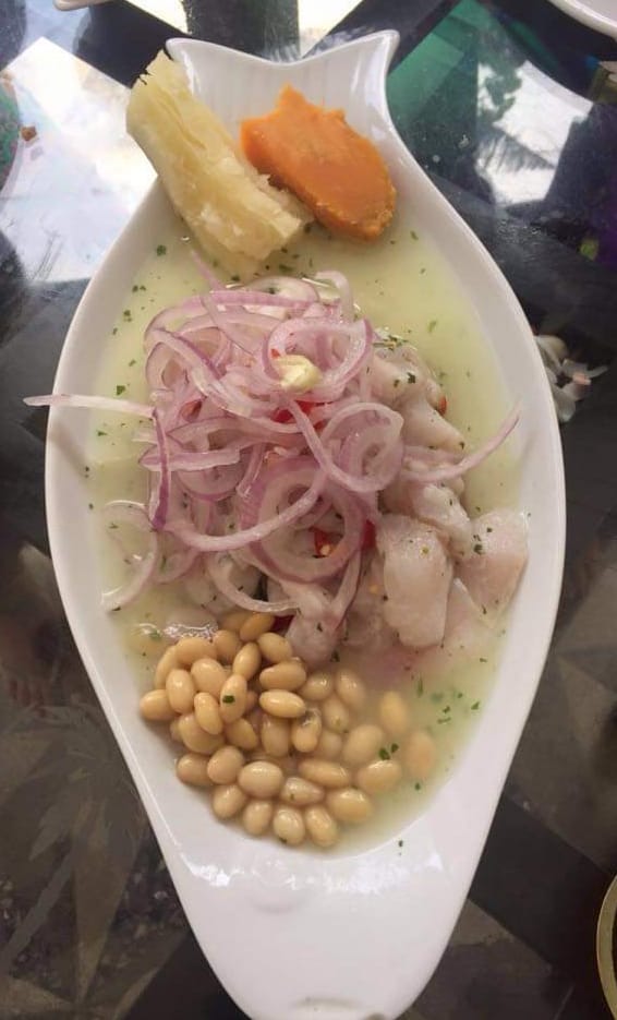 Ceviche de pescado, causa de pollo y arroz con mariscos arrisotado.