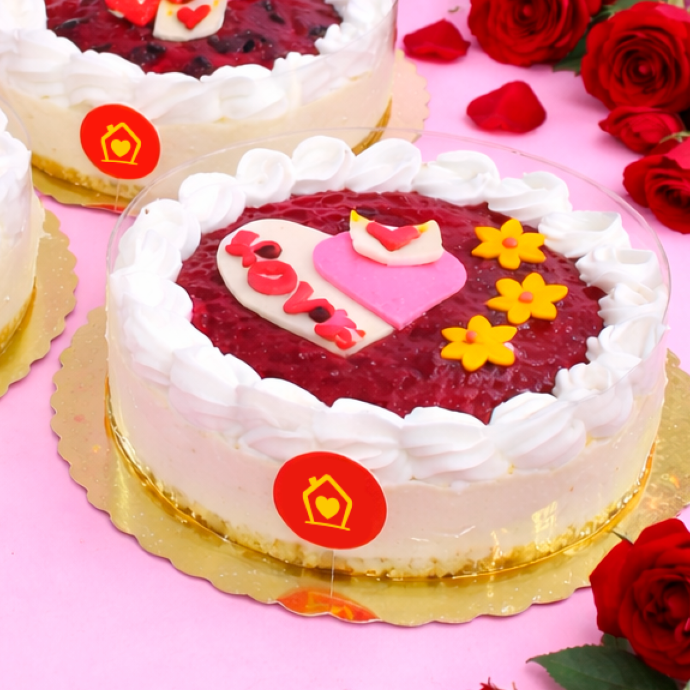 Cheesecake con base crocante de galleta, queso crema, mermelada de sauco con una decoración romántica.