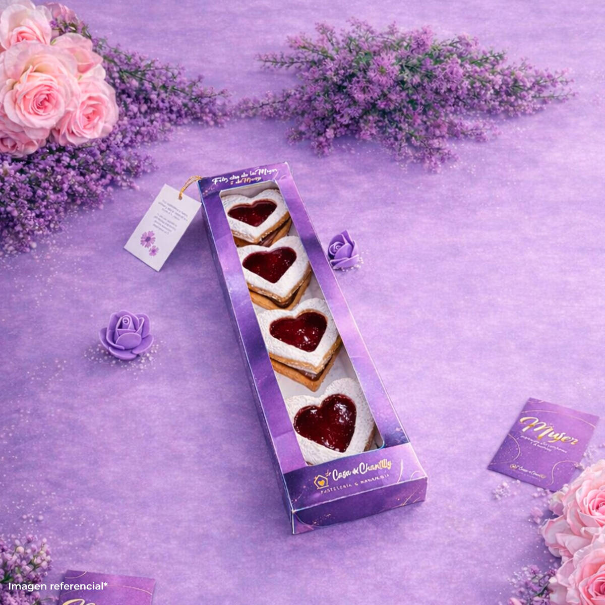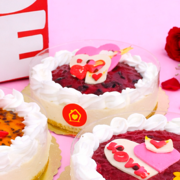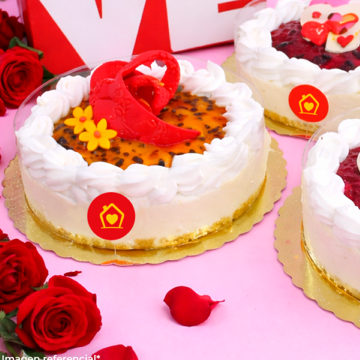 Cheesecake con base crocante de galleta, queso crema, mermelada de maracuya con una decoración romántica.