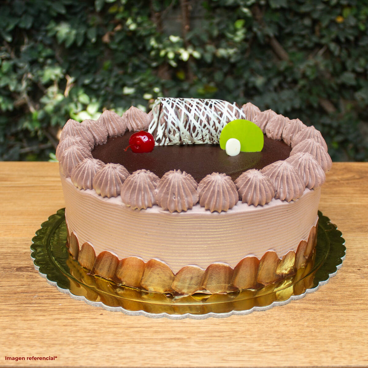 Delicioso keke de chocolate humedecido en almíbar de café con relleno de cremoso chocolate más crema de moka, 26 de diámetro y rinde para 25 porciones aproximadamente.