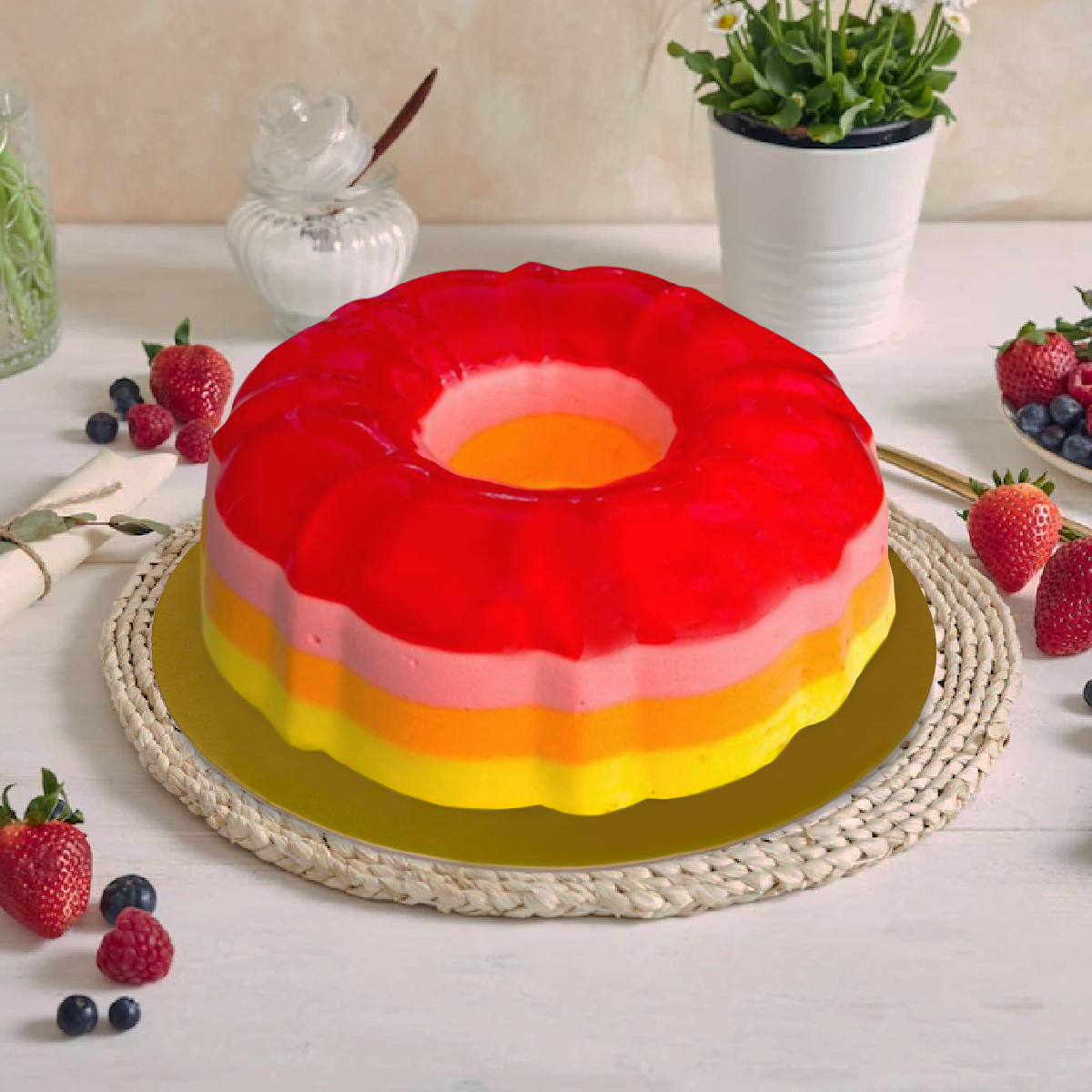 Delicioso mousse de piña, fresa y naranja con relleno de keke cubierta con gelatina de fresa. Para 15 porciones.