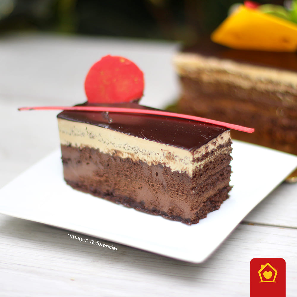 Delicioso keke de chocolate humedecido en almíbar de café, relleno de cremoso de chocolate y crema de moka.