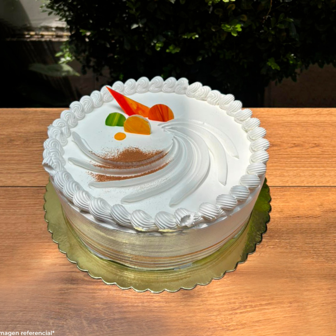 Bizcochuelo especial con doble relleno de crema chantilly, humedecido en jarabe de tres leches.