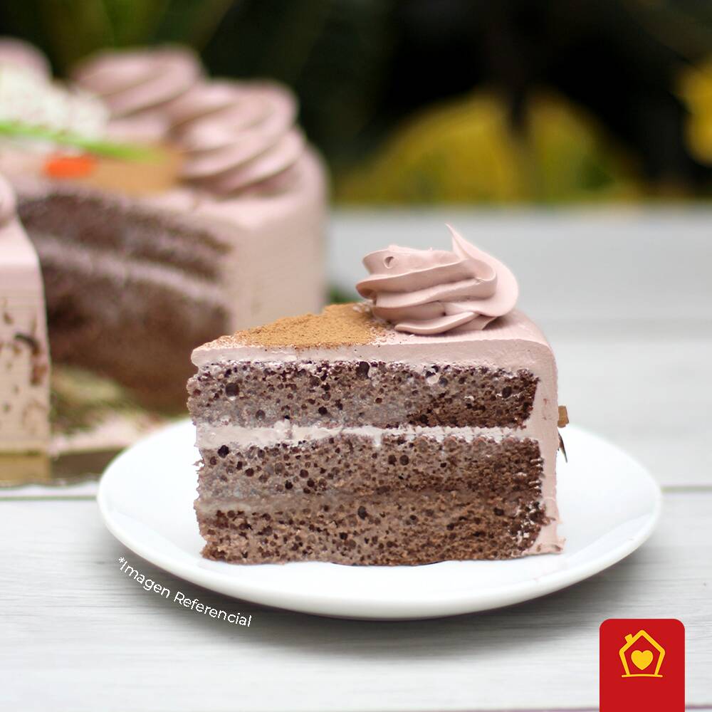 Delicioso keke de chocolate humedecido en almíbar de café con doble relleno de crema de moka.
