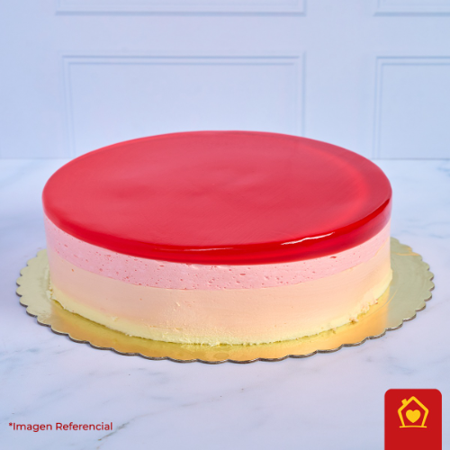 Mousse de queso crema con una base crocante de galleta de vainilla y topping de mermelada de fresa, 22 de diámetro y rinde para 12 a 15 porciones.
