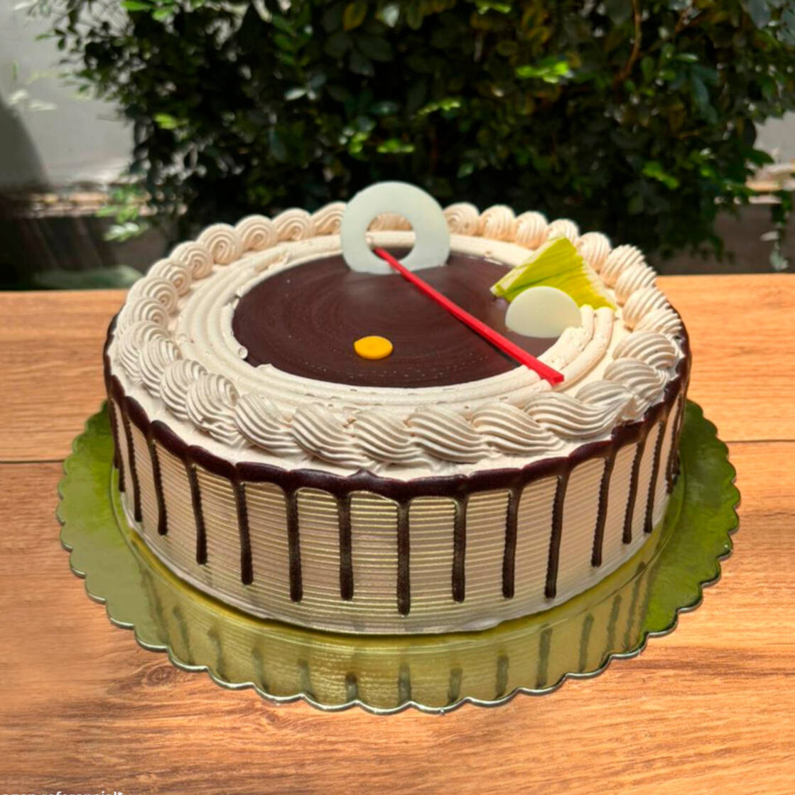 Delicioso keke de chocolate humedecido en almíbar de café con relleno de cremoso chocolate más crema de moka, 26 de diámetro y rinde para 25 porciones aproximadamente.