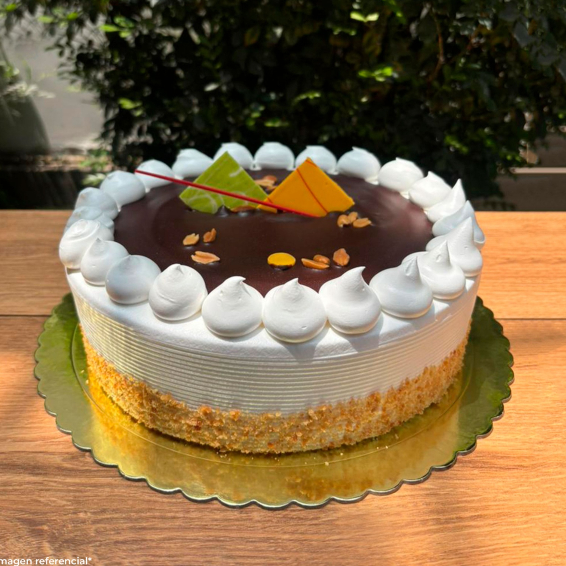 Keke de chocolate premium con doble relleno de manjar blanco más cobertura de chocolate rallado, 26 de diámetro y rinde para 25 porciones aproximadamente.