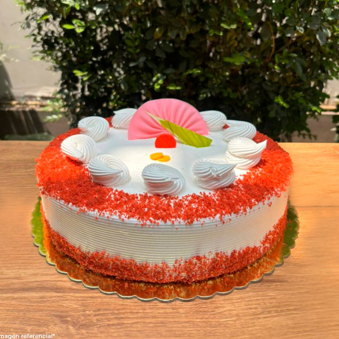 Keke red velvet con keke de vainilla con doble relleno de crema de fresa, humedecido en jarabe de tres leches, 26 de diámetro y rinde para 25 porciones aproximadamente.
