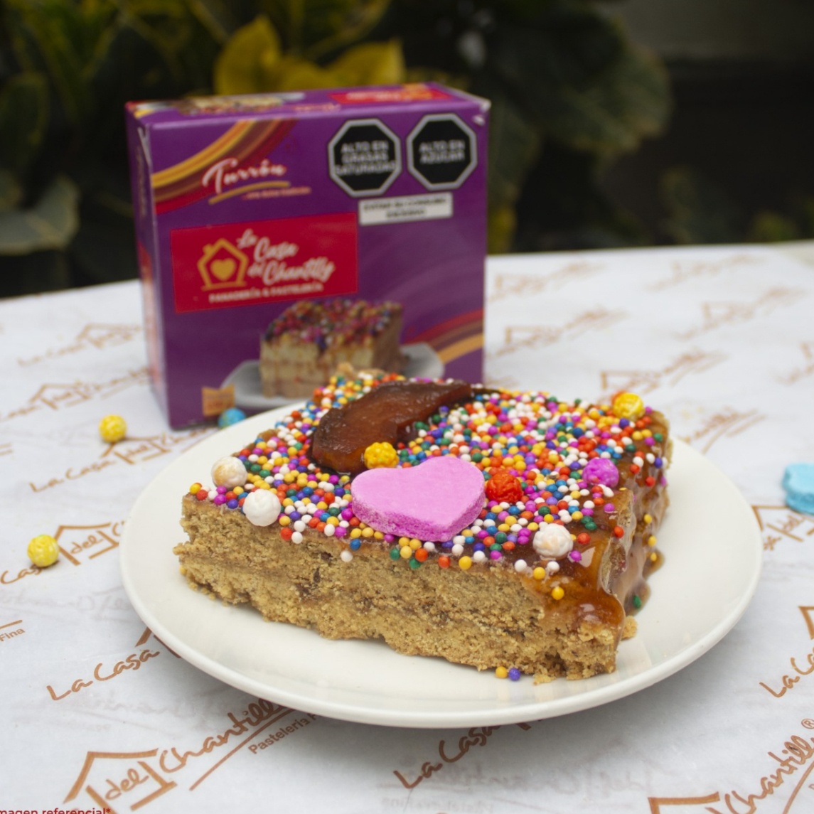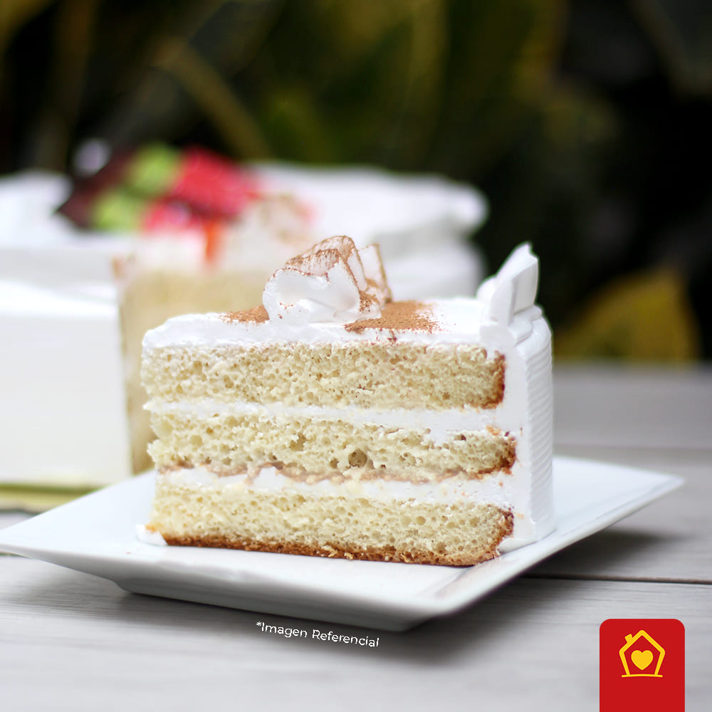 Bizcochuelo especial con doble relleno de manjar y crema de café, humedecido en jarabe de tres leches.