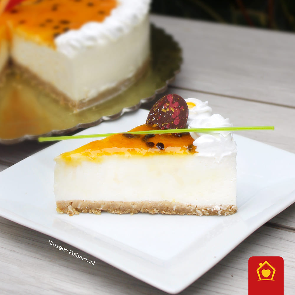 Mousse de queso crema con una base crocante de galleta de vainilla y topping de mermelada de maracuyá, 22 de diámetro y rinde para 12 a 15 porciones.