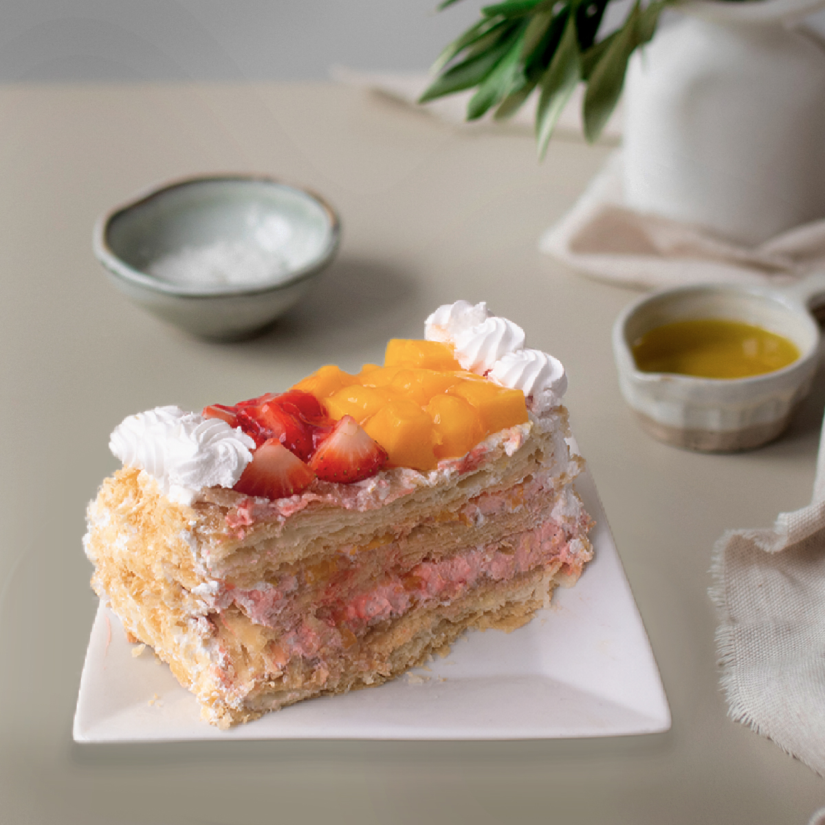 Deliciosa masa quebrada con crema pastelera, chantilly con fresa, durazno y otras frutas de estación.