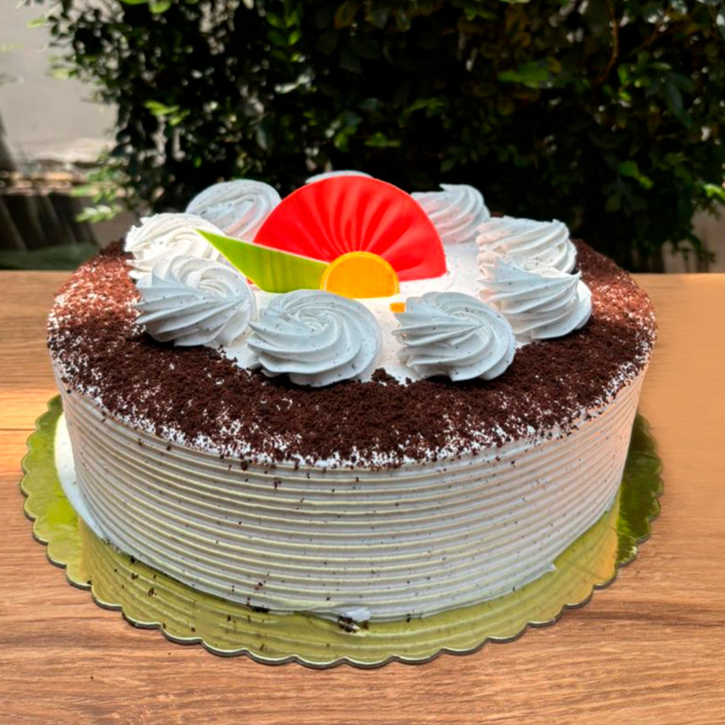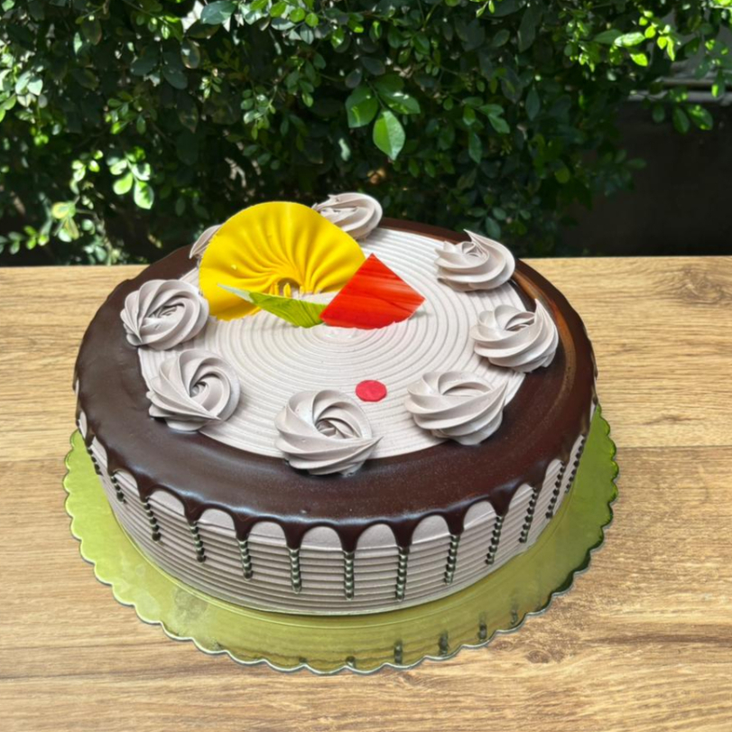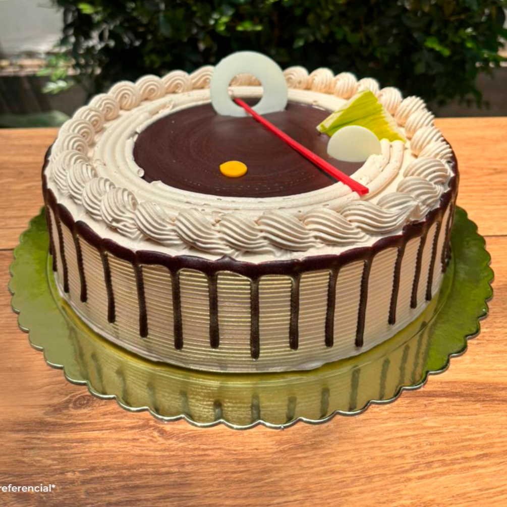 Delicioso keke de chocolate humedecido en almíbar de café con relleno de cremoso chocolate más crema de moka, 26 de diámetro y rinde para 25 porciones aproximadamente.