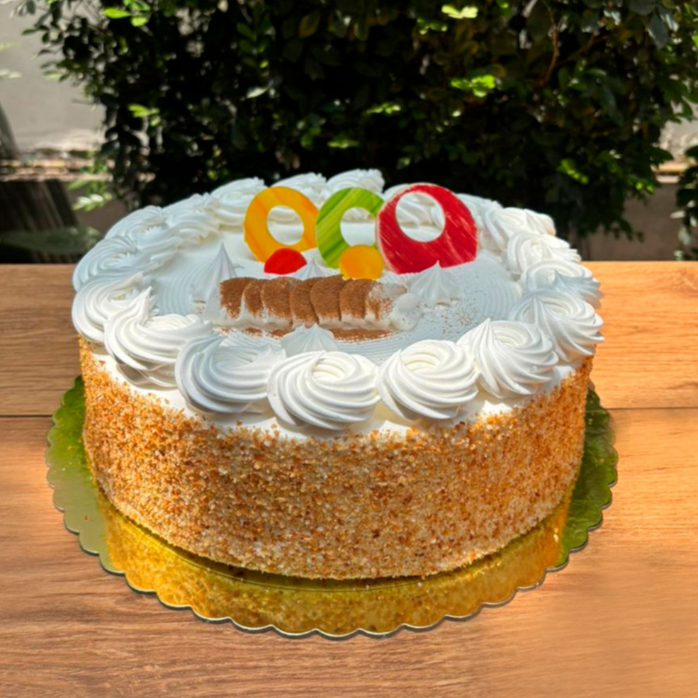 Bizcochuelo especial con doble relleno de manjar y crema de café, humedecido en jarabe de tres leches.