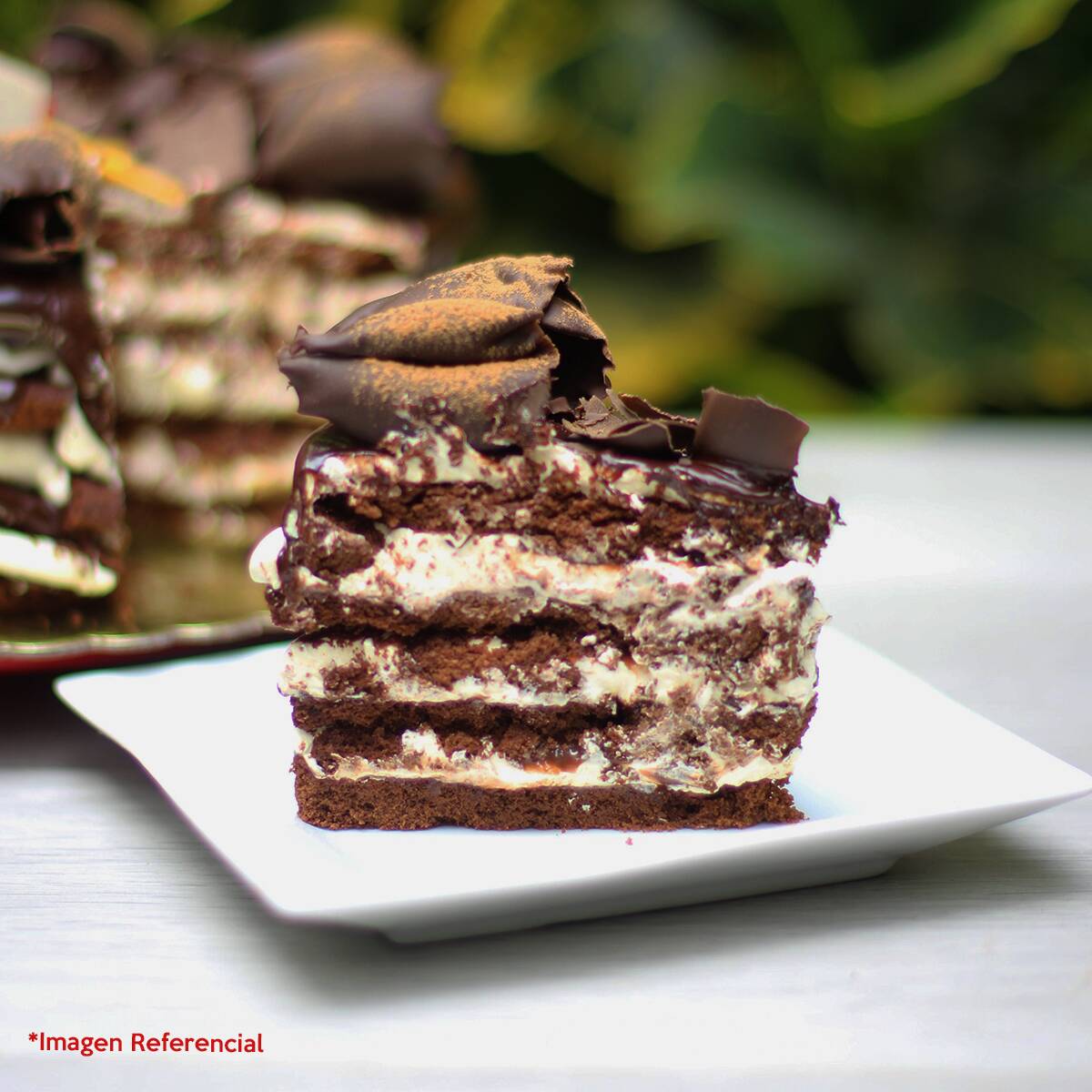 Delicioso keke de chocolate humedecido en almíbar de café, relleno de cremoso de chocolate y crema de moka.