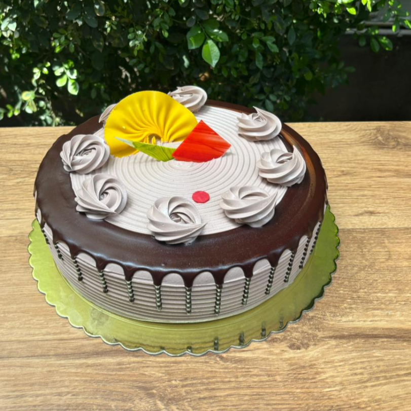 Deliciosa torta con keke de chocolate relleno con crema ligera y trocitos de mango.