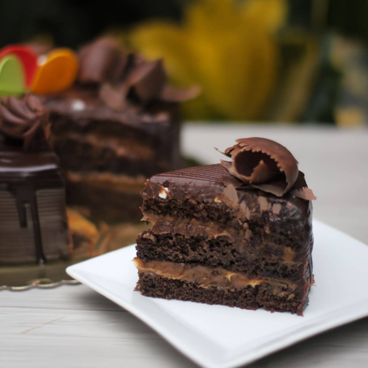 Delicioso keke de chocolate humedecido en almíbar de café, relleno de cremoso de chocolate y crema de moka.