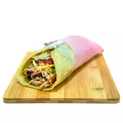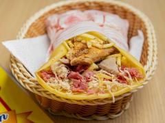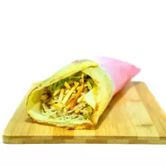 Tortilla, queso, filete de pollo, cremas y papas al hilo.