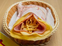 Tortilla, queso, pavo horneado, cremas y papas al hilo.