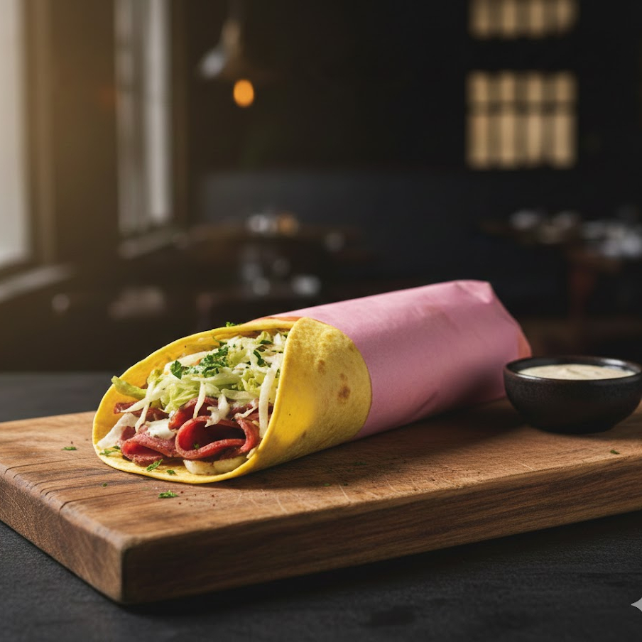 Tortilla, queso, lomito ahumado, cremas y papas al hilo.