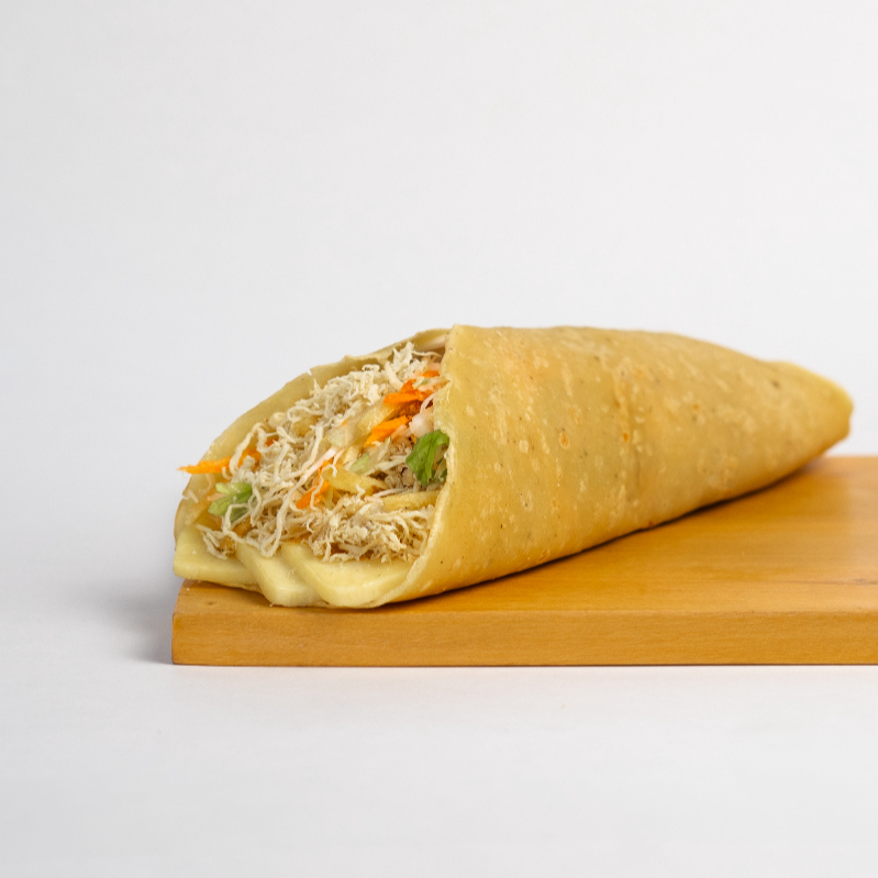 Tortilla, queso y pollo deshilachado.