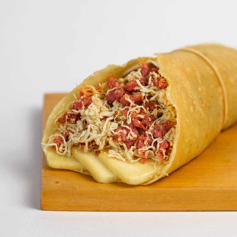 Tortilla, frejol, chorizo y pollo deshilachado.