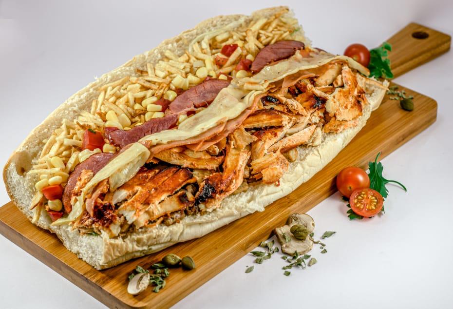 Pan Pepito 30 cm con tocino crujiente, maíz dulce, jamón inglés, queso fundido, pollo y carne shawarma, lechuga, tomate y papas al hilo.