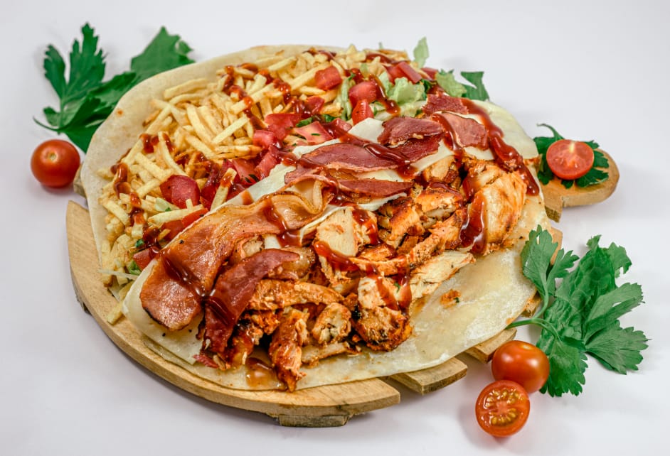 Shawarma de pollo ahumado con BBQ, tocino ahumado, queso cheddar, tomate, lechuga y papas al hilo.