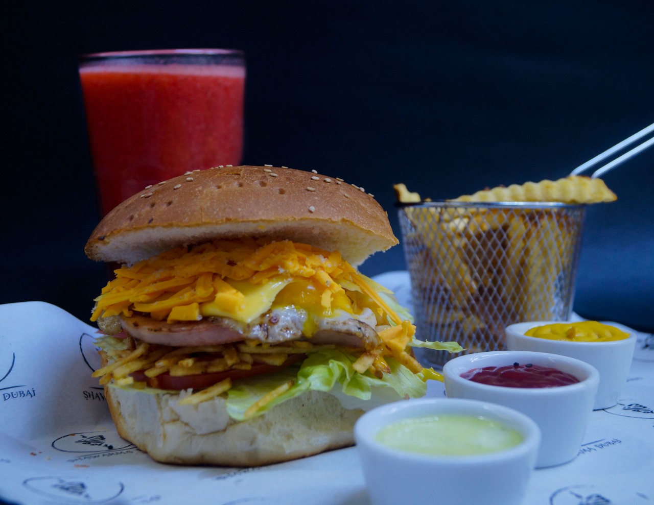 Hamburguesa rellena de queso cheddar con jamón y tocino.