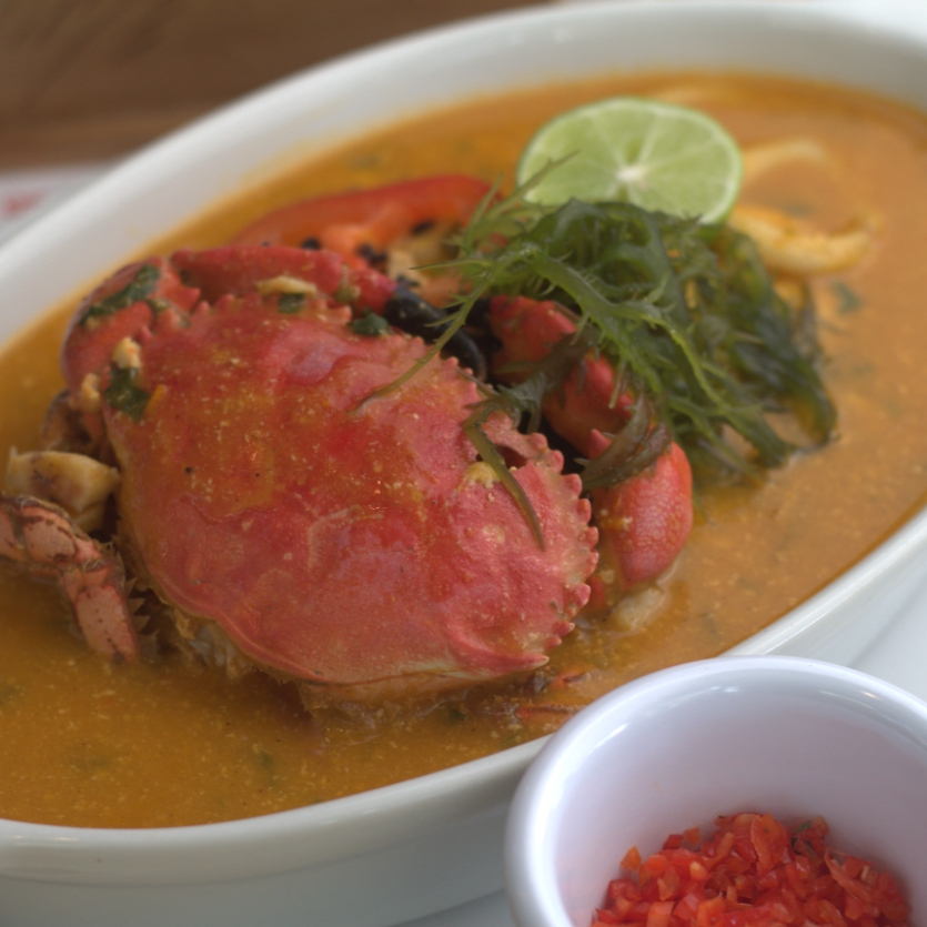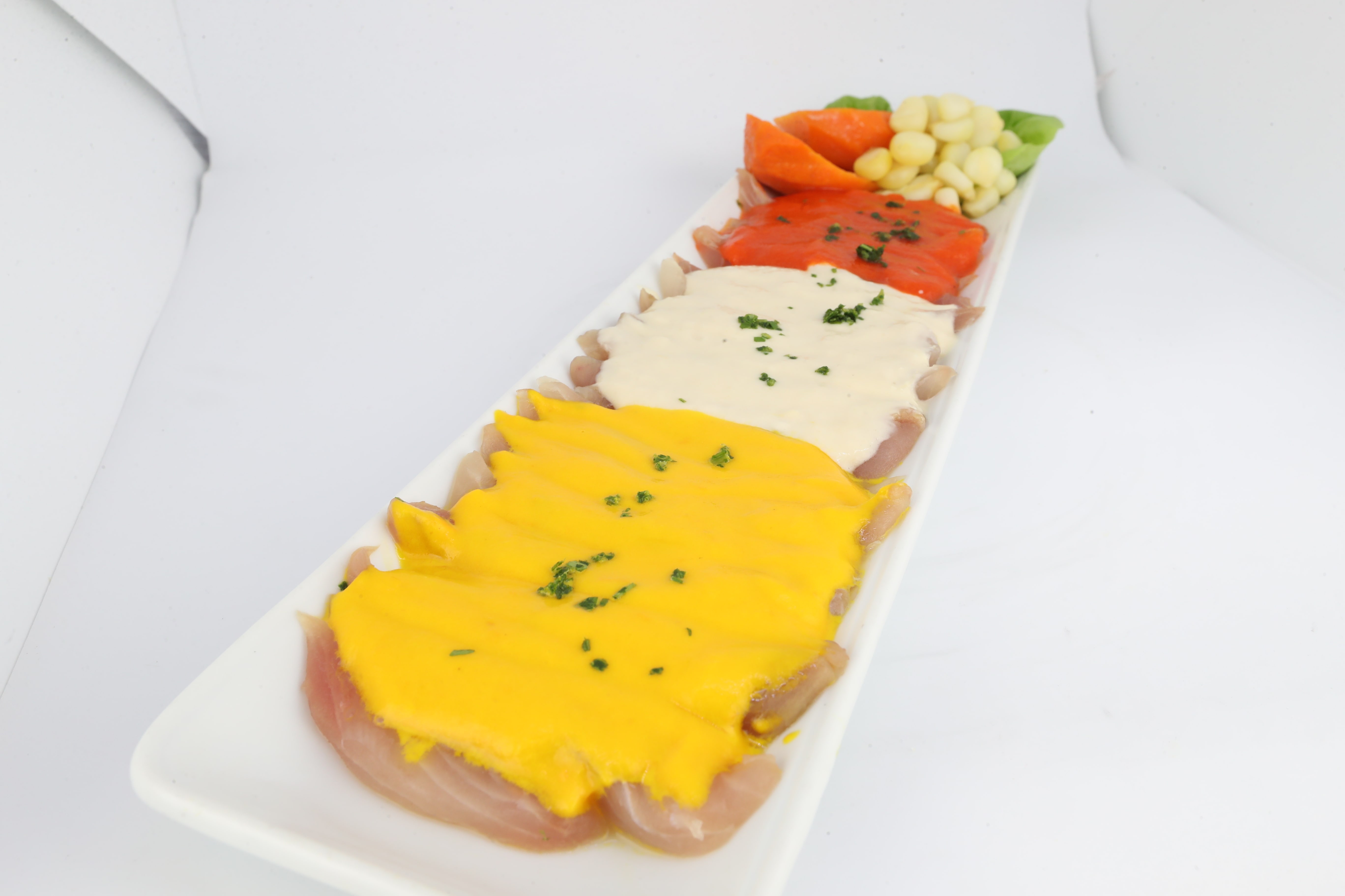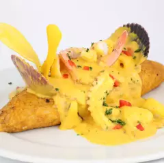 Ceviche mixto a base de finos trozos de pescado y mariscos de la estación preparado con un mix de tres deliciosas cremas de vegetales, rocoto y ají amarillo.