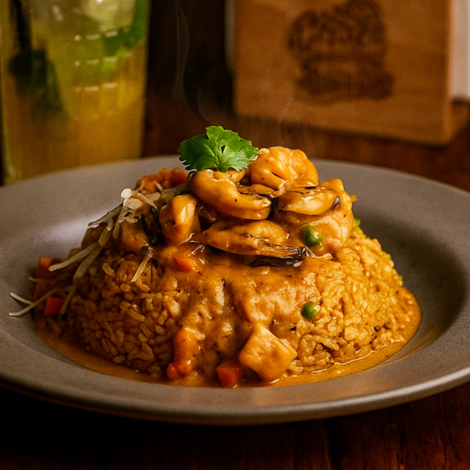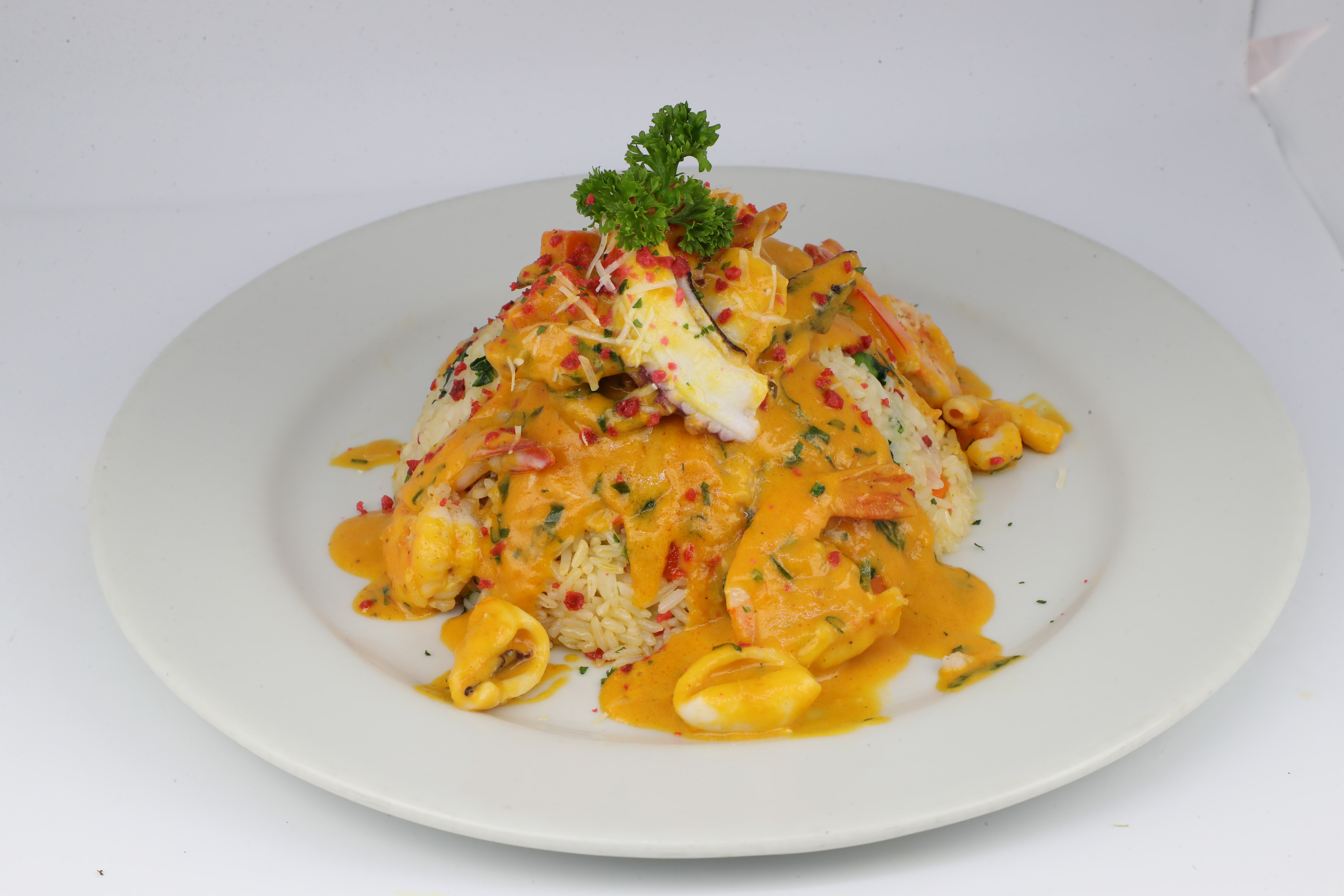 Arroz con mariscos salteados, cocinados con nuestra salsa madre, decorado con queso parmesano