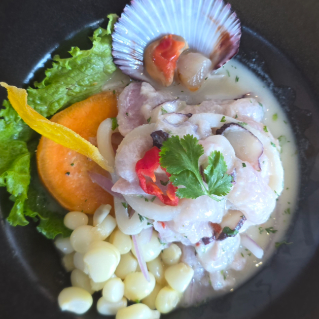 Trozos de pescado y selectos mariscos marinados en nuestra deliciosa leche de tigre chozera.