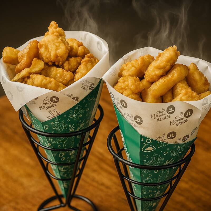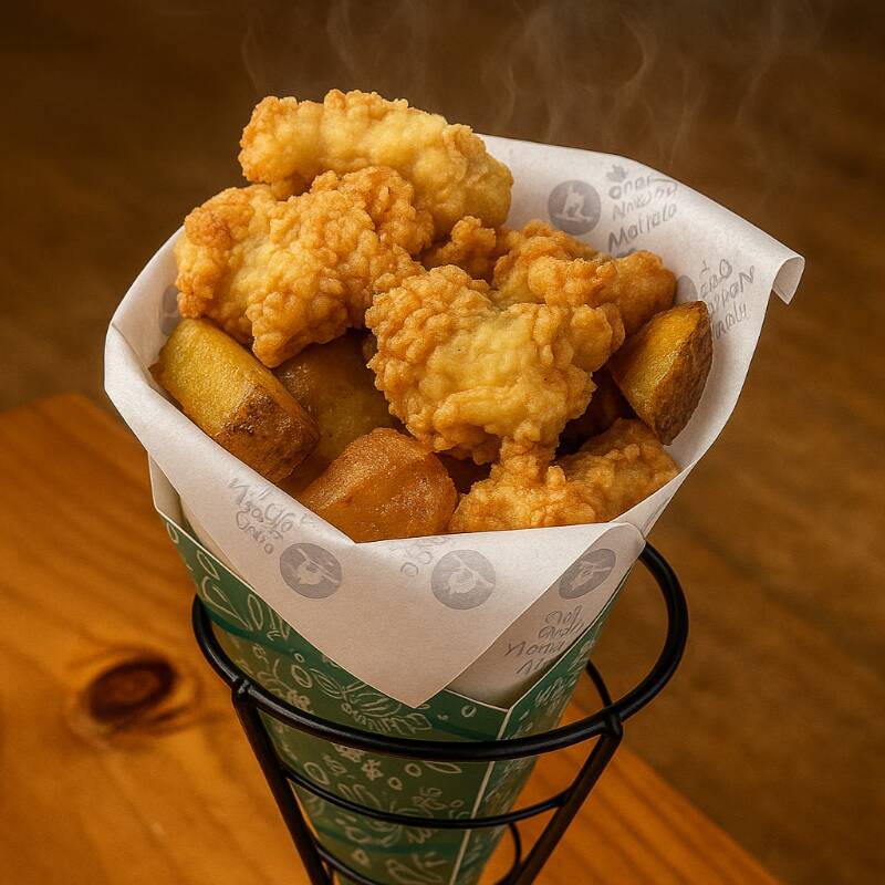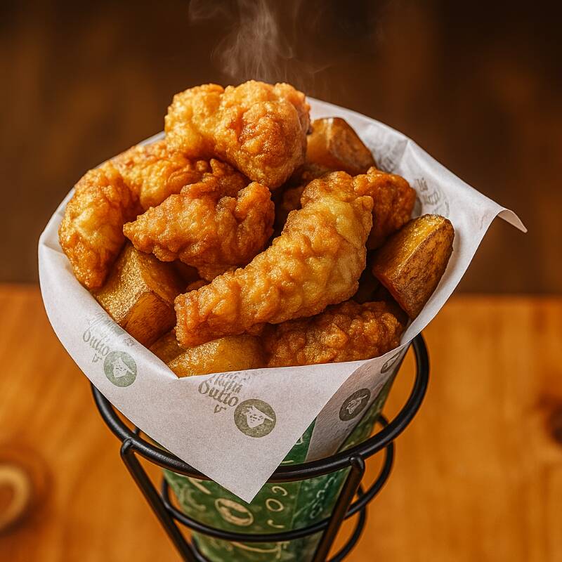 Crujientes trozos de pescados marinados en nuestra base de la casa, servidos con yuyo broaster, hilos de camote y tartara.