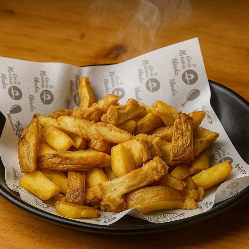 Porción de papas amarillas fritas con crocante chicharrón de pota