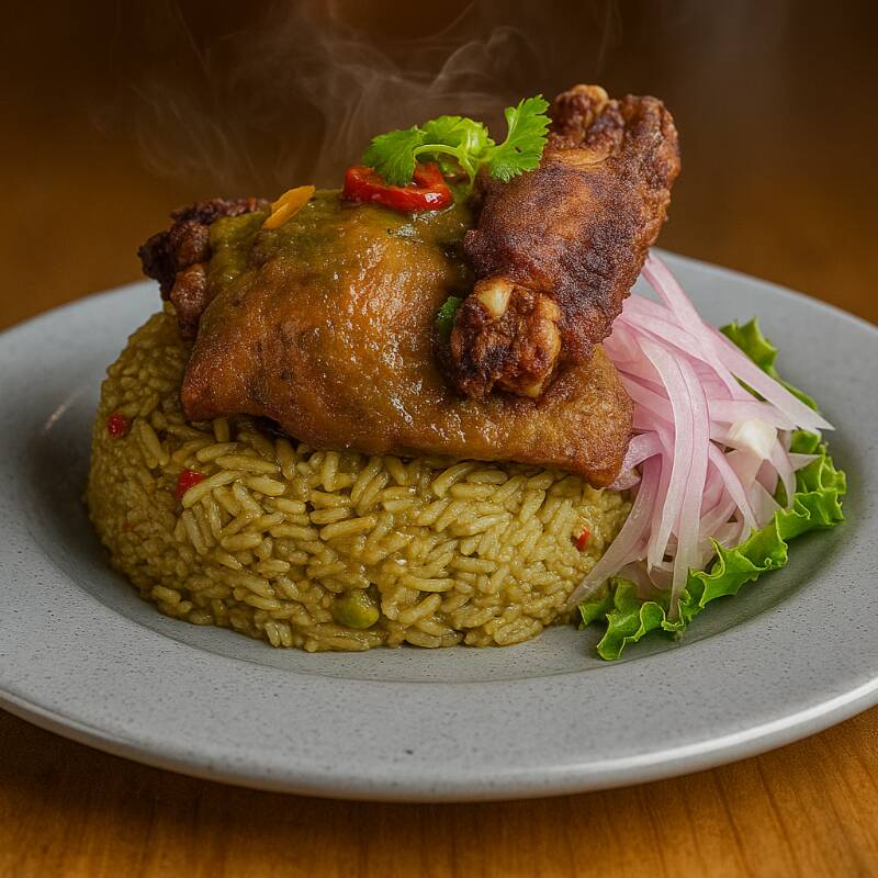 Un cuarto de pato tierno cocinado por mas de ocho horas en base de zapallo loche y chichita de jora hasta obtener el sabor deseado. Servido con Sarsa criolla.