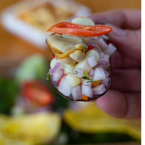 MEJILLONES COCIDOS, CUBIERTOS CON UNA SARZA CRIOLLA EN SU PUNTO ACEVICHADO.