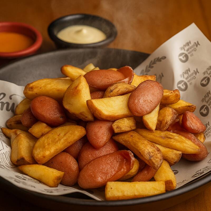 Salchipapa con papas amarillas fritas y chicharrón de pota