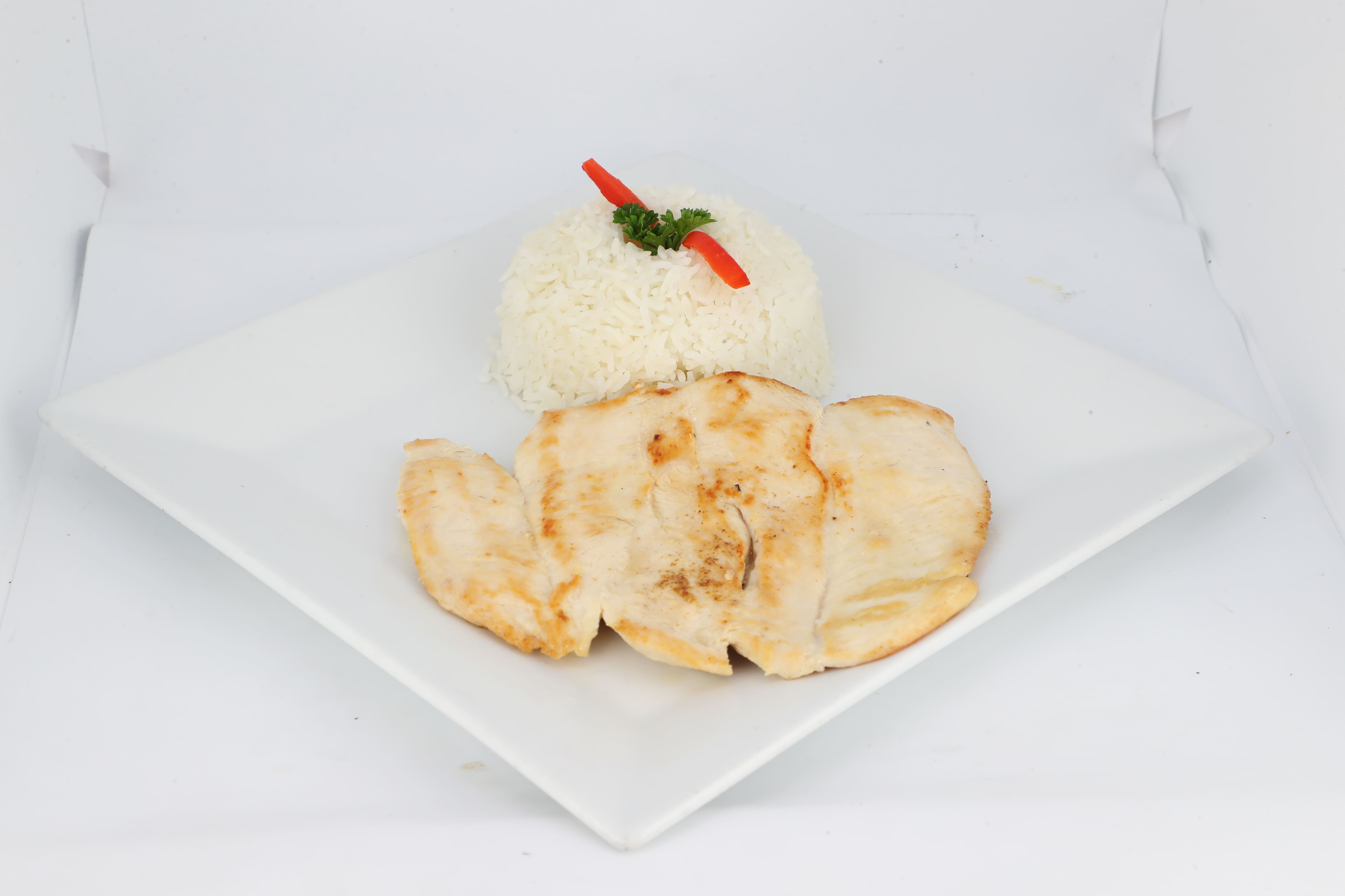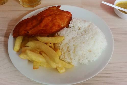 Crocante milanesa de pollo al panko con papas fritas y arroz.