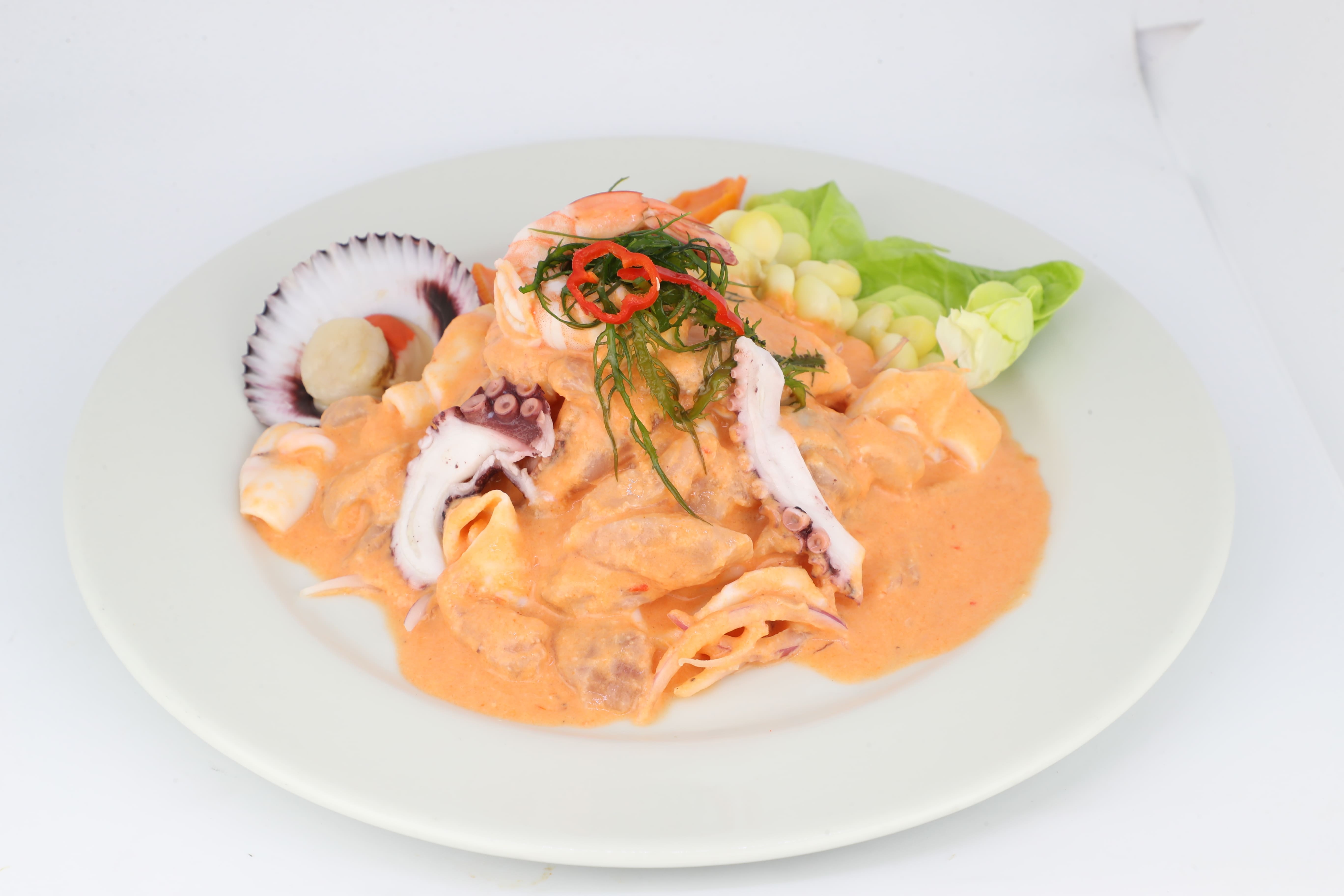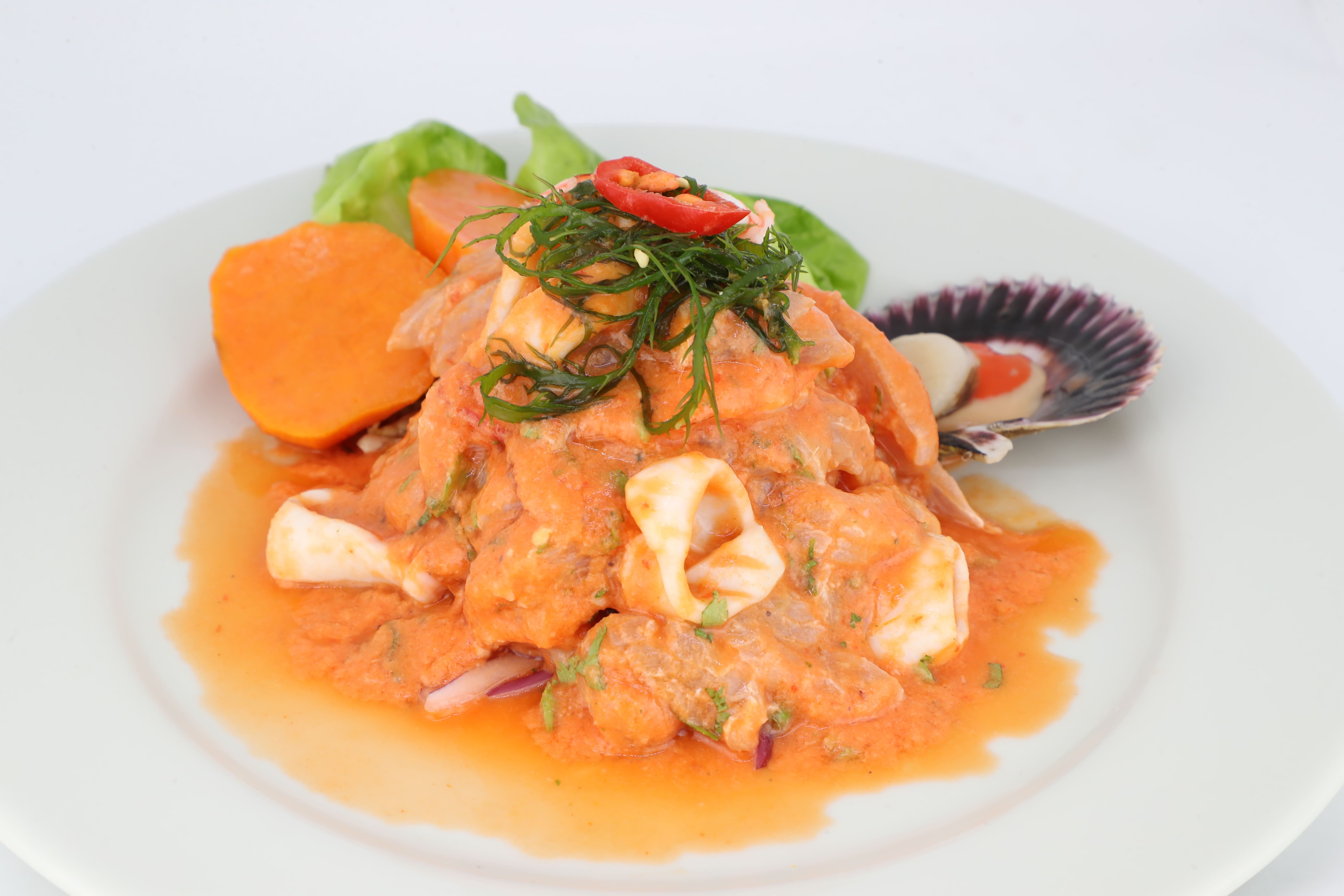 Finos trozos de pescado y frescos mariscos de la estación en una mixtura de crema de vegetales y crema de rocoto.