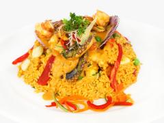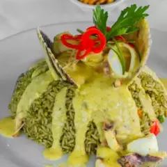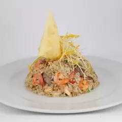 Clásico arroz con mariscos ahumado en ligero punto picante acompañado de salsa norteña.