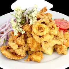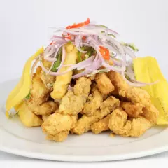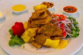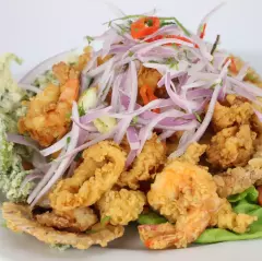 Jalea de trozos de pescado y mariscos con yuca frita, yuyo frito y zarza criolla de cebolla.