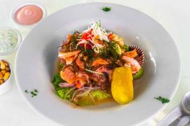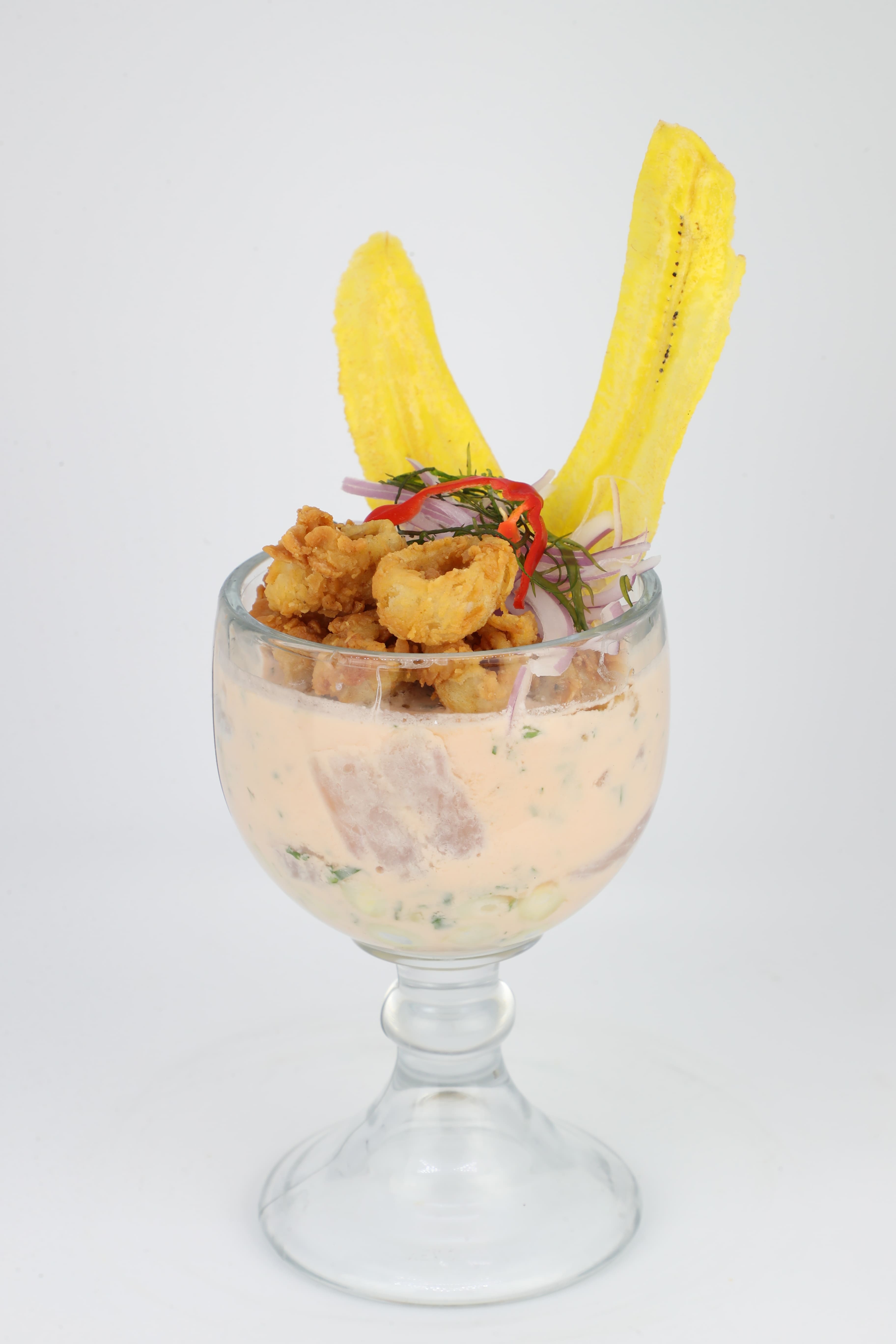 Combinación de una deliciosa causa de pulpa de cangrejo y ceviche mixto, acompañado de un shot de leche de tigre.