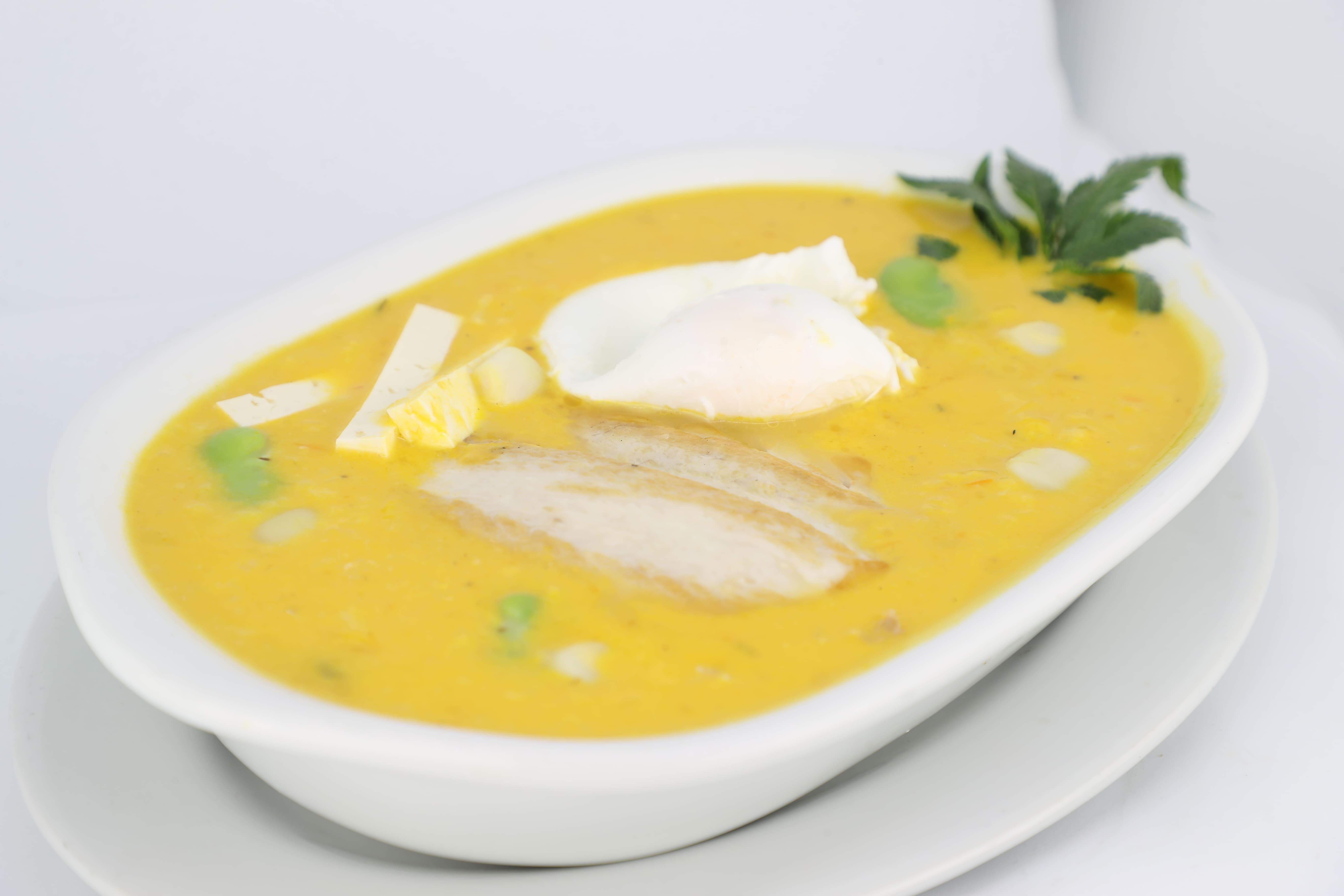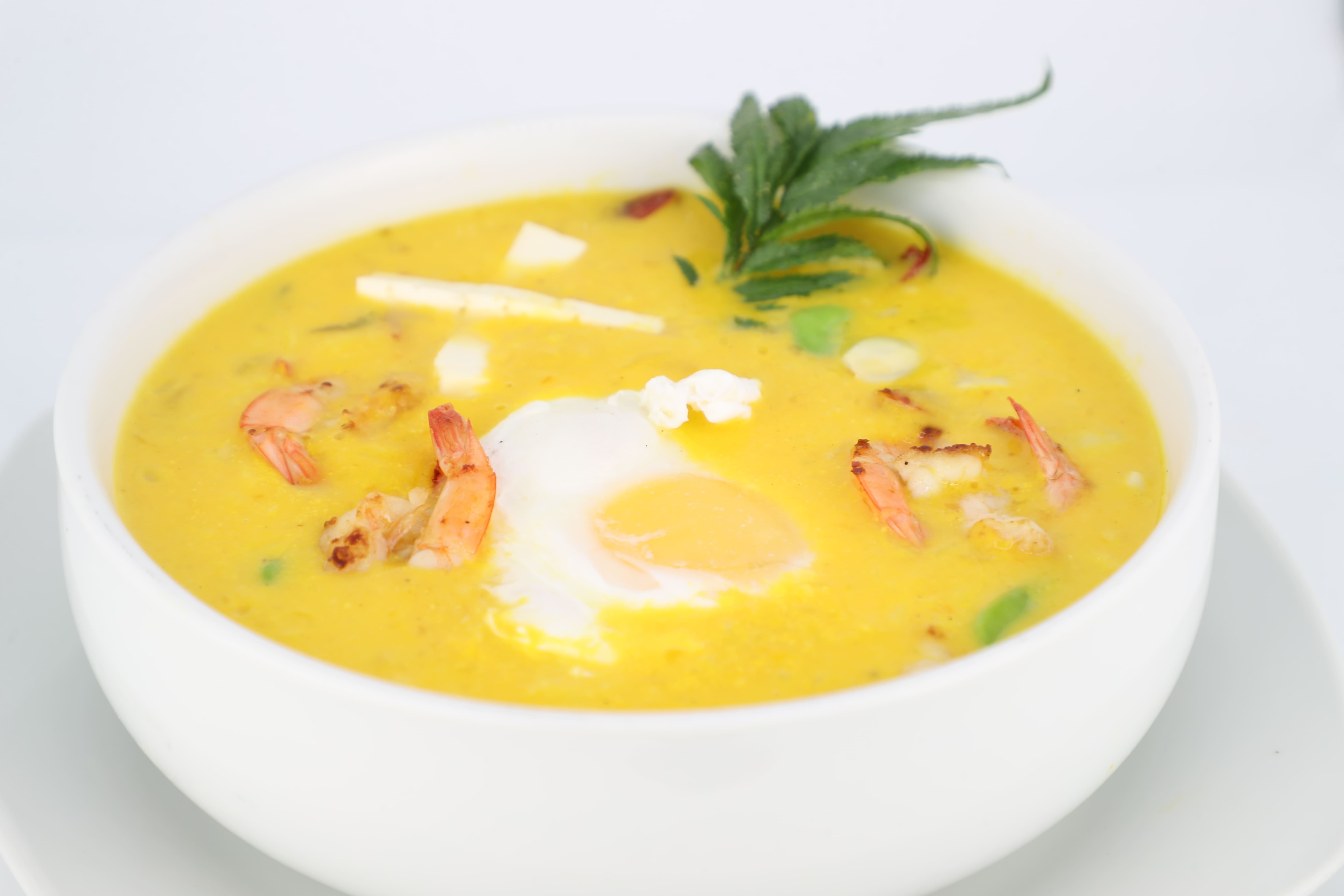 Chupe de langostinos a base de zapallo, habas y queso fresco.